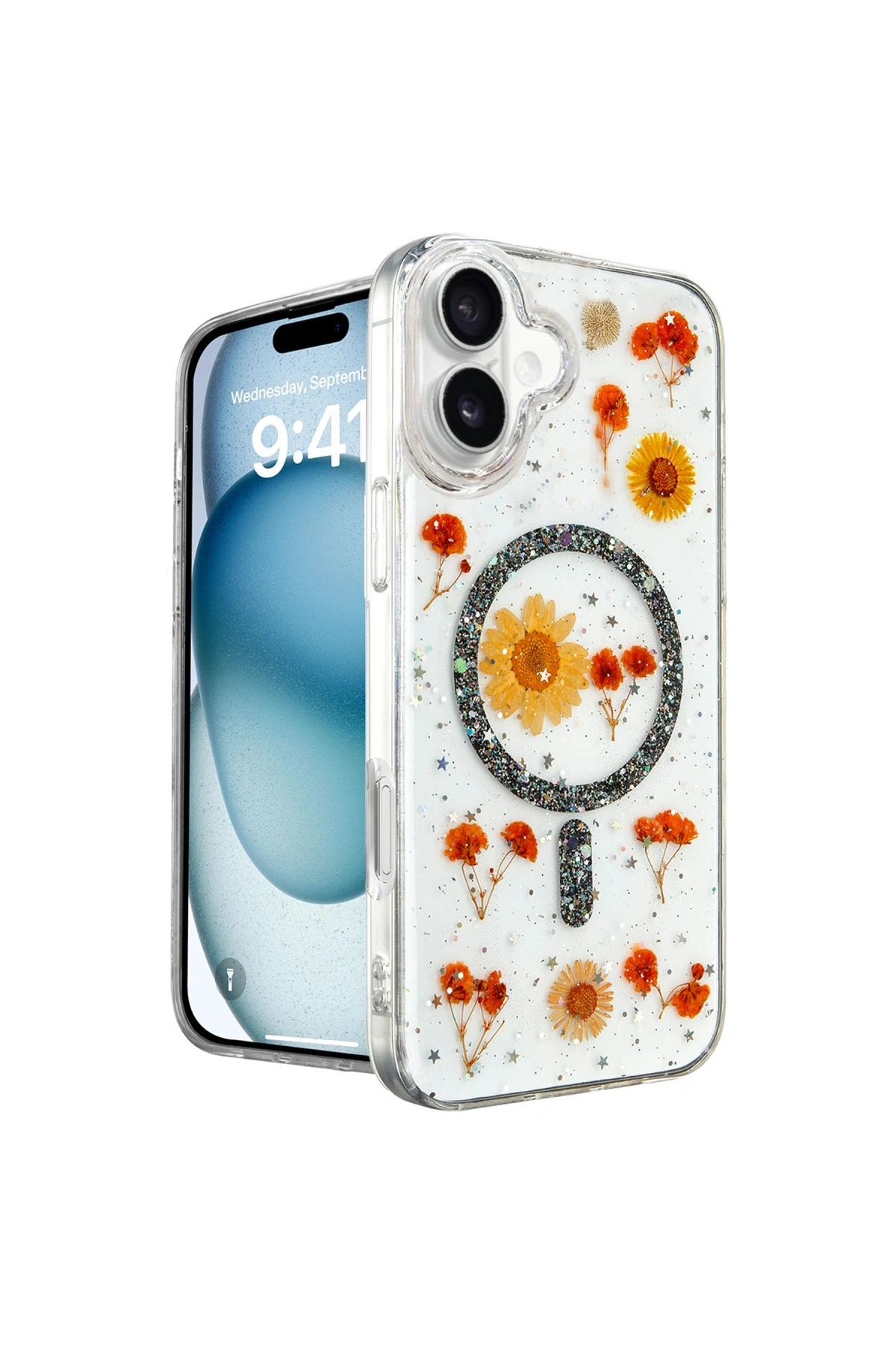 Daisy Simli Magsafe Kapak ---- uyumludur.; Doğadan İlham Alan TasarımDaisy Simli MagSafe Kapak, doğanın zarafetini ve sadeliğini yansıtan, içinde gerçek çiçeklerin bulunduğu eşsiz bir tasarıma sahiptir.; Kapak, içindeki gerçek papatya çiçekleri ve simli arka planı ile cihazınıza doğal bir güzellik katarken, her kapak kendi içinde benzersizdir.; Bu, telefonunuzu hem korurken hem de ona kişisel bir dokunuş ekler.; MagSafe UyumluKapak, MagSafe aksesuarları ve şarj cihazları ile tam uyumludur.; İçerisinde yer alan güçlü manyetik halka, MagSafe şarj cihazları ve aksesuarlarıyla sorunsuz bir bağlantı kurmanızı sağlar.; Kablosuz şarj işlemini kapak çıkarılmadan gerçekleştirebilir, aynı zamanda MagSafe aksesuarlarınızı kolayca kullanabilirsiniz.; Dayanıklı ve Koruyucu MalzemeDaisy Simli MagSafe Kapak, cihazınızı günlük hayatta oluşabilecek darbelere, çizilmelere ve düşmelere karşı korumak için dayanıklı malzemelerden üretilmiştir.; Esnek yapısı sayesinde telefonunuza mükemmel bir şekilde uyum sağlar ve kolayca takılıp çıkarılabilir.; Yükseltilmiş Kenar KorumasıKapak, telefonunuzun ekranını ve kamerasını koruma altına almak için yükseltilmiş kenarlara sahiptir.; Bu özellik, cihazınızı düz bir yüzeye koyduğunuzda ekran ve kameranın çizilmesini engelleyerek ekstra koruma sağlar.; Kolay Erişim ve Düğme HassasiyetiKapak, telefonunuzun tüm portlarına, düğmelerine ve işlevlerine tam erişim imkanı sunar.; Düğme hassasiyeti korunarak, cihazınızın ses kontrolü, güç düğmesi gibi işlevleri rahatlıkla kullanılabilir.