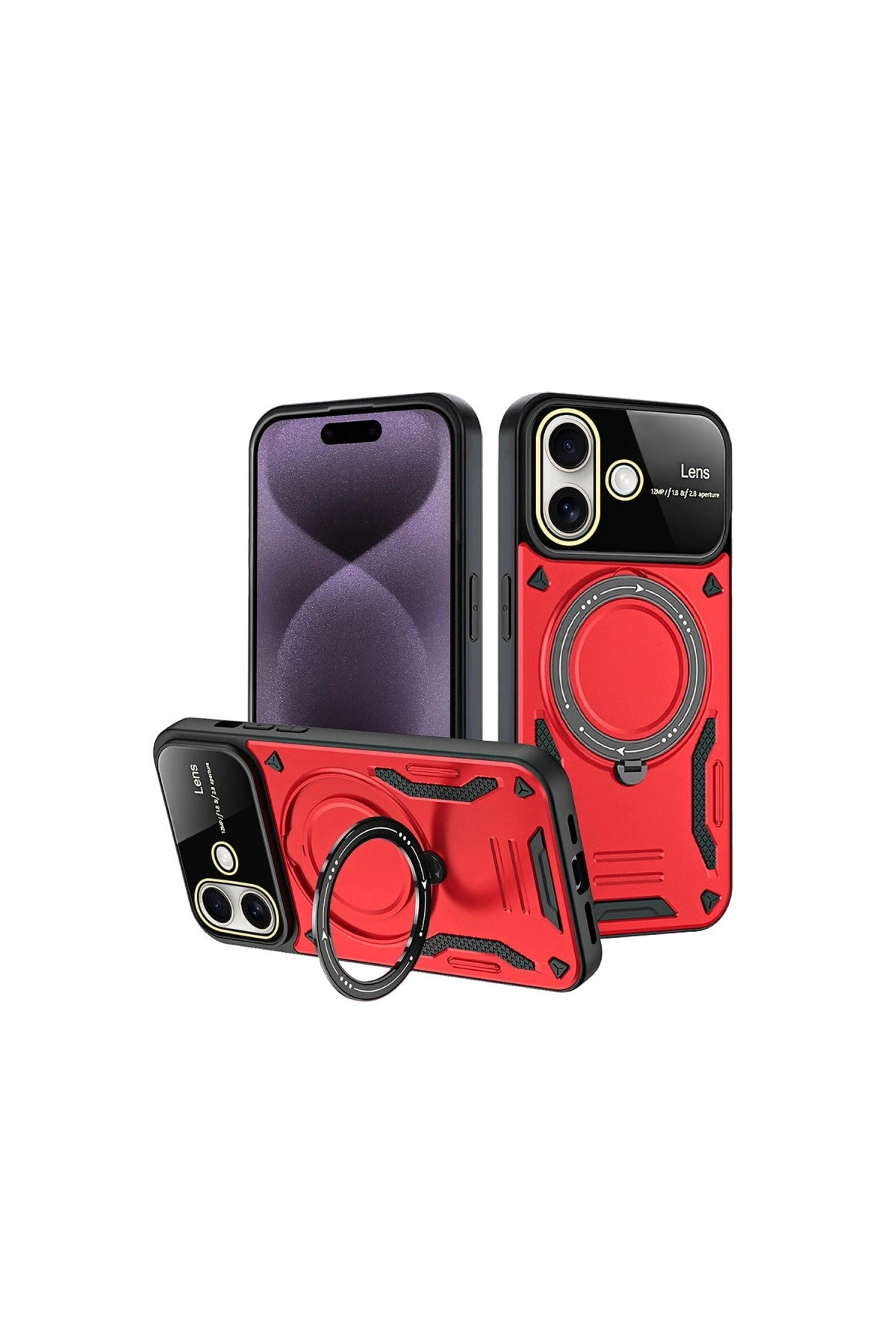 İphone 16 Kılıf Joy Lens Standlı Kapak - Kırmızı