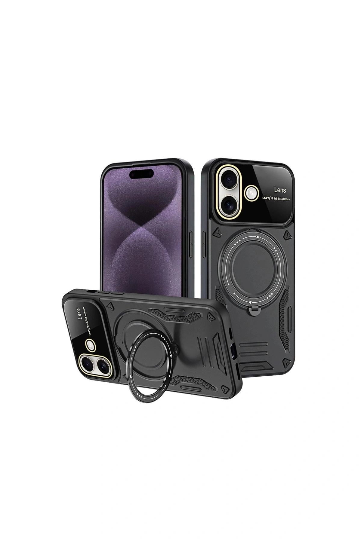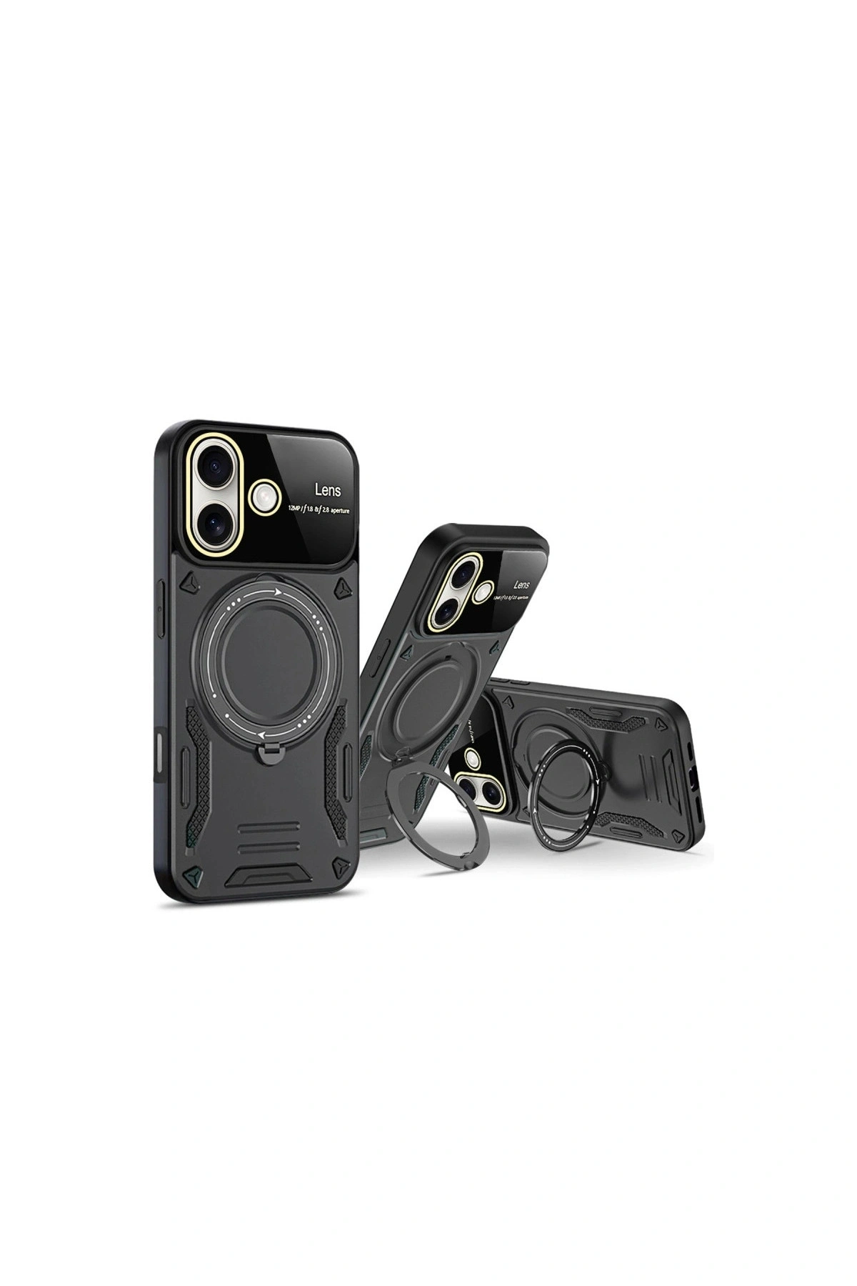 İphone 16 Kılıf Joy Lens Standlı Kapak - Siyah