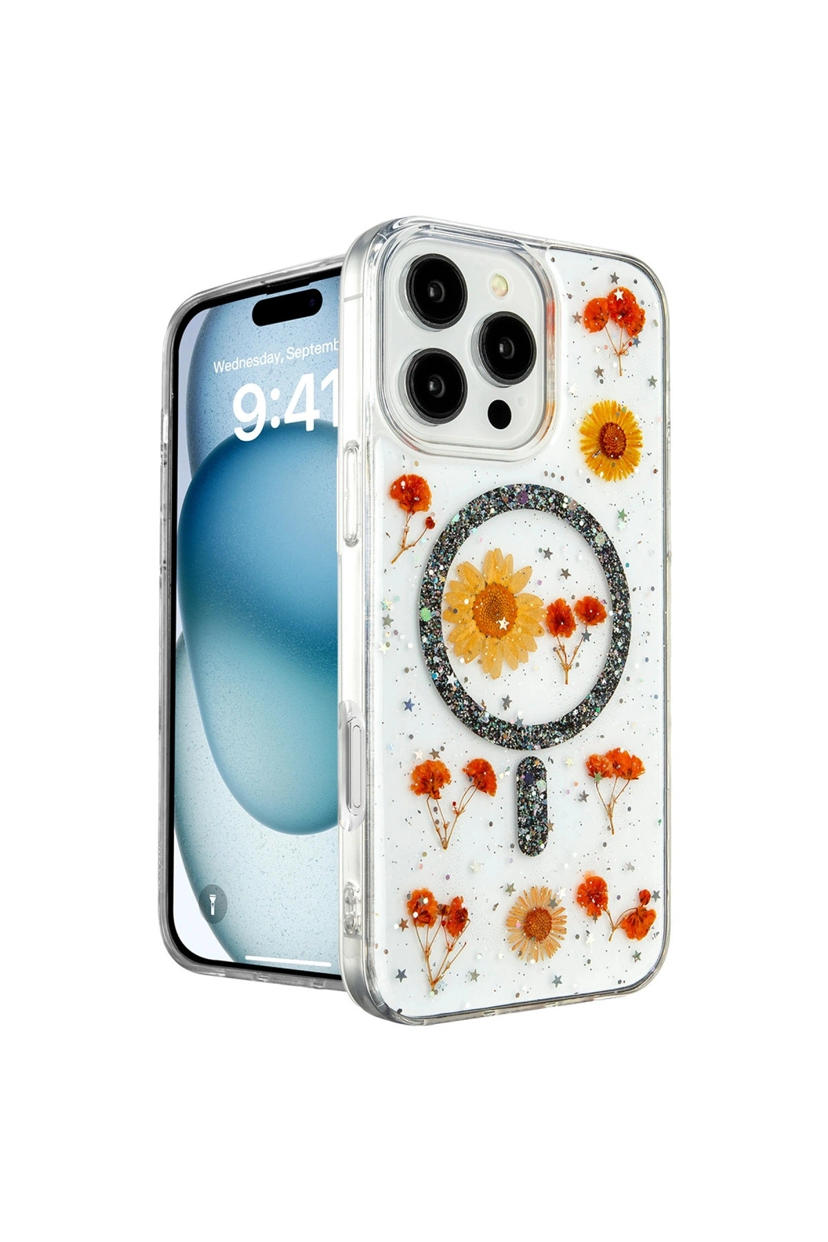 Daisy Simli Magsafe Kapak ---- uyumludur.; Doğadan İlham Alan TasarımDaisy Simli MagSafe Kapak, doğanın zarafetini ve sadeliğini yansıtan, içinde gerçek çiçeklerin bulunduğu eşsiz bir tasarıma sahiptir.; Kapak, içindeki gerçek papatya çiçekleri ve simli arka planı ile cihazınıza doğal bir güzellik katarken, her kapak kendi içinde benzersizdir.; Bu, telefonunuzu hem korurken hem de ona kişisel bir dokunuş ekler.; MagSafe UyumluKapak, MagSafe aksesuarları ve şarj cihazları ile tam uyumludur.; İçerisinde yer alan güçlü manyetik halka, MagSafe şarj cihazları ve aksesuarlarıyla sorunsuz bir bağlantı kurmanızı sağlar.; Kablosuz şarj işlemini kapak çıkarılmadan gerçekleştirebilir, aynı zamanda MagSafe aksesuarlarınızı kolayca kullanabilirsiniz.; Dayanıklı ve Koruyucu MalzemeDaisy Simli MagSafe Kapak, cihazınızı günlük hayatta oluşabilecek darbelere, çizilmelere ve düşmelere karşı korumak için dayanıklı malzemelerden üretilmiştir.; Esnek yapısı sayesinde telefonunuza mükemmel bir şekilde uyum sağlar ve kolayca takılıp çıkarılabilir.; Yükseltilmiş Kenar KorumasıKapak, telefonunuzun ekranını ve kamerasını koruma altına almak için yükseltilmiş kenarlara sahiptir.; Bu özellik, cihazınızı düz bir yüzeye koyduğunuzda ekran ve kameranın çizilmesini engelleyerek ekstra koruma sağlar.; Kolay Erişim ve Düğme HassasiyetiKapak, telefonunuzun tüm portlarına, düğmelerine ve işlevlerine tam erişim imkanı sunar.; Düğme hassasiyeti korunarak, cihazınızın ses kontrolü, güç düğmesi gibi işlevleri rahatlıkla kullanılabilir.
