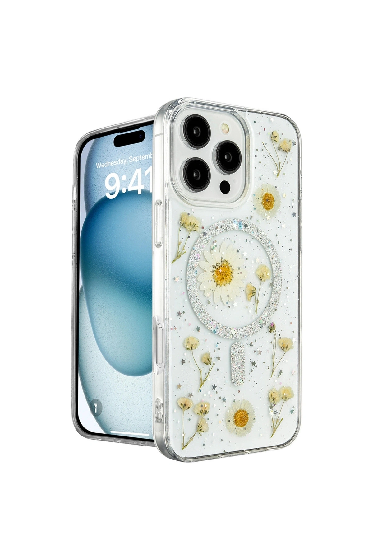Daisy Simli Magsafe Kapak ---- uyumludur.; Doğadan İlham Alan TasarımDaisy Simli MagSafe Kapak, doğanın zarafetini ve sadeliğini yansıtan, içinde gerçek çiçeklerin bulunduğu eşsiz bir tasarıma sahiptir.; Kapak, içindeki gerçek papatya çiçekleri ve simli arka planı ile cihazınıza doğal bir güzellik katarken, her kapak kendi içinde benzersizdir.; Bu, telefonunuzu hem korurken hem de ona kişisel bir dokunuş ekler.; MagSafe UyumluKapak, MagSafe aksesuarları ve şarj cihazları ile tam uyumludur.; İçerisinde yer alan güçlü manyetik halka, MagSafe şarj cihazları ve aksesuarlarıyla sorunsuz bir bağlantı kurmanızı sağlar.; Kablosuz şarj işlemini kapak çıkarılmadan gerçekleştirebilir, aynı zamanda MagSafe aksesuarlarınızı kolayca kullanabilirsiniz.; Dayanıklı ve Koruyucu MalzemeDaisy Simli MagSafe Kapak, cihazınızı günlük hayatta oluşabilecek darbelere, çizilmelere ve düşmelere karşı korumak için dayanıklı malzemelerden üretilmiştir.; Esnek yapısı sayesinde telefonunuza mükemmel bir şekilde uyum sağlar ve kolayca takılıp çıkarılabilir.; Yükseltilmiş Kenar KorumasıKapak, telefonunuzun ekranını ve kamerasını koruma altına almak için yükseltilmiş kenarlara sahiptir.; Bu özellik, cihazınızı düz bir yüzeye koyduğunuzda ekran ve kameranın çizilmesini engelleyerek ekstra koruma sağlar.; Kolay Erişim ve Düğme HassasiyetiKapak, telefonunuzun tüm portlarına, düğmelerine ve işlevlerine tam erişim imkanı sunar.; Düğme hassasiyeti korunarak, cihazınızın ses kontrolü, güç düğmesi gibi işlevleri rahatlıkla kullanılabilir.