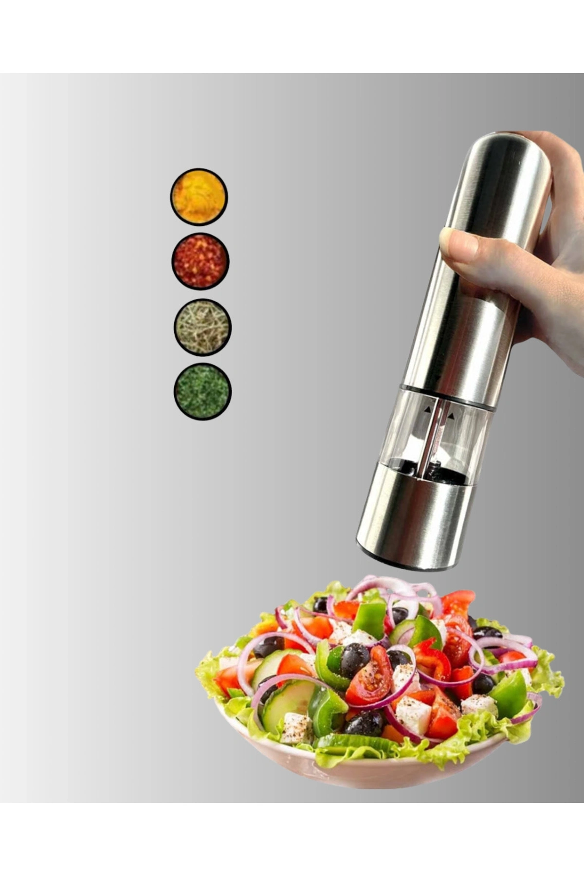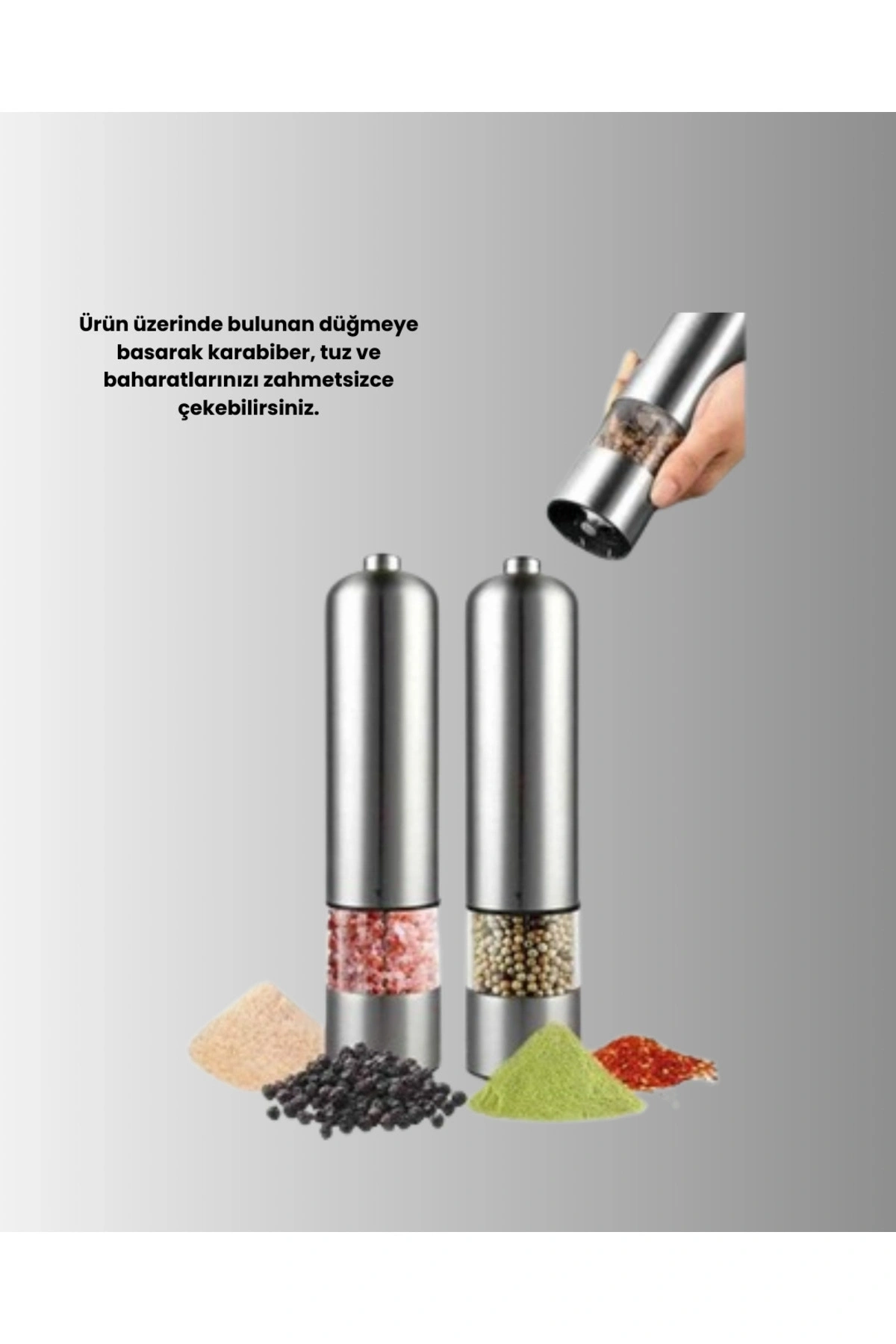 Bu pilli otomatik baharat değirmeni, modern mutfaklar için hem şık hem de kullanışlı bir çözümdür.; Üzerinde bulunan düğmeye basarak baharatlarınızı anında taze şekilde çekebilirsiniz.; Işıklı yapısı sayesinde ölçülü ve kontrollü kullanım sağlar.; Karabiber, tuz ve benzeri baharatlar için uygundur.; Ürün 1 adet olarak gönderilmektedir, piller pakete dahil değildir.