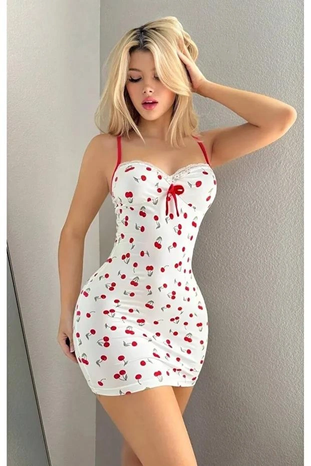 Kadın Beyaz Kiraz Desenli Askılı Bağlamalı Dantel Detaylı Elbise 5073