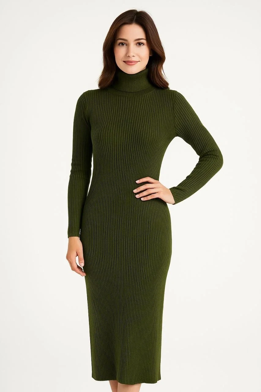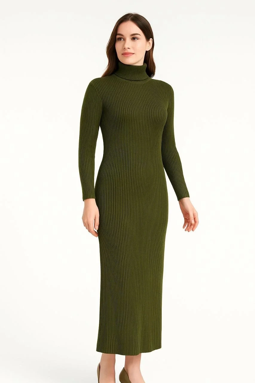 • Kadın Boğazlı Triko Elbise – Uzun Fitilli Esnek Dokuma, Tam Kalıp, Kışlık & Baharlık Şık Rahat Stil, 130 cm Midi Boy Elbise - Haki