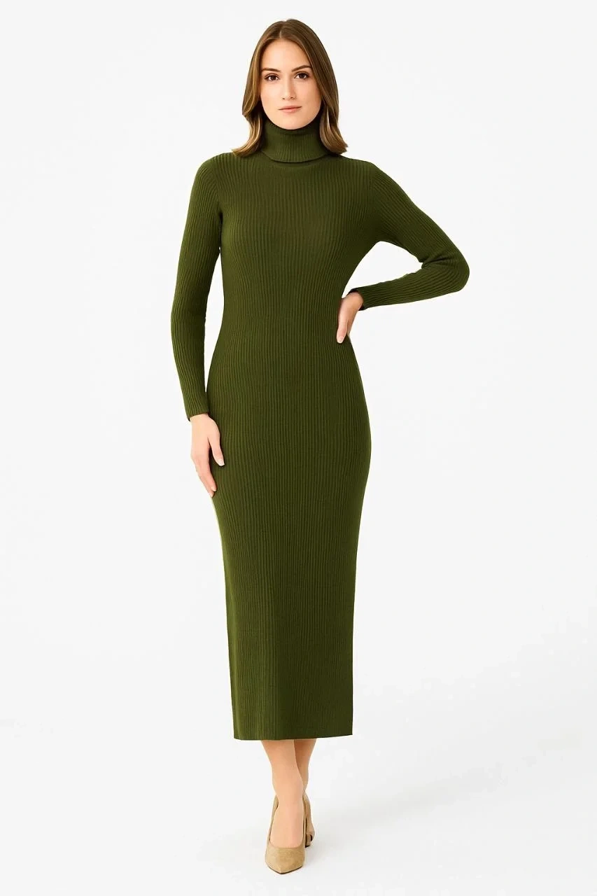 Kadın Boğazlı Triko Elbise – Uzun Fitilli Esnek Dokuma, Tam Kalıp, Kışlık & Baharlık Şık Rahat Stil, 130 cm Midi Boy Elbise - Haki