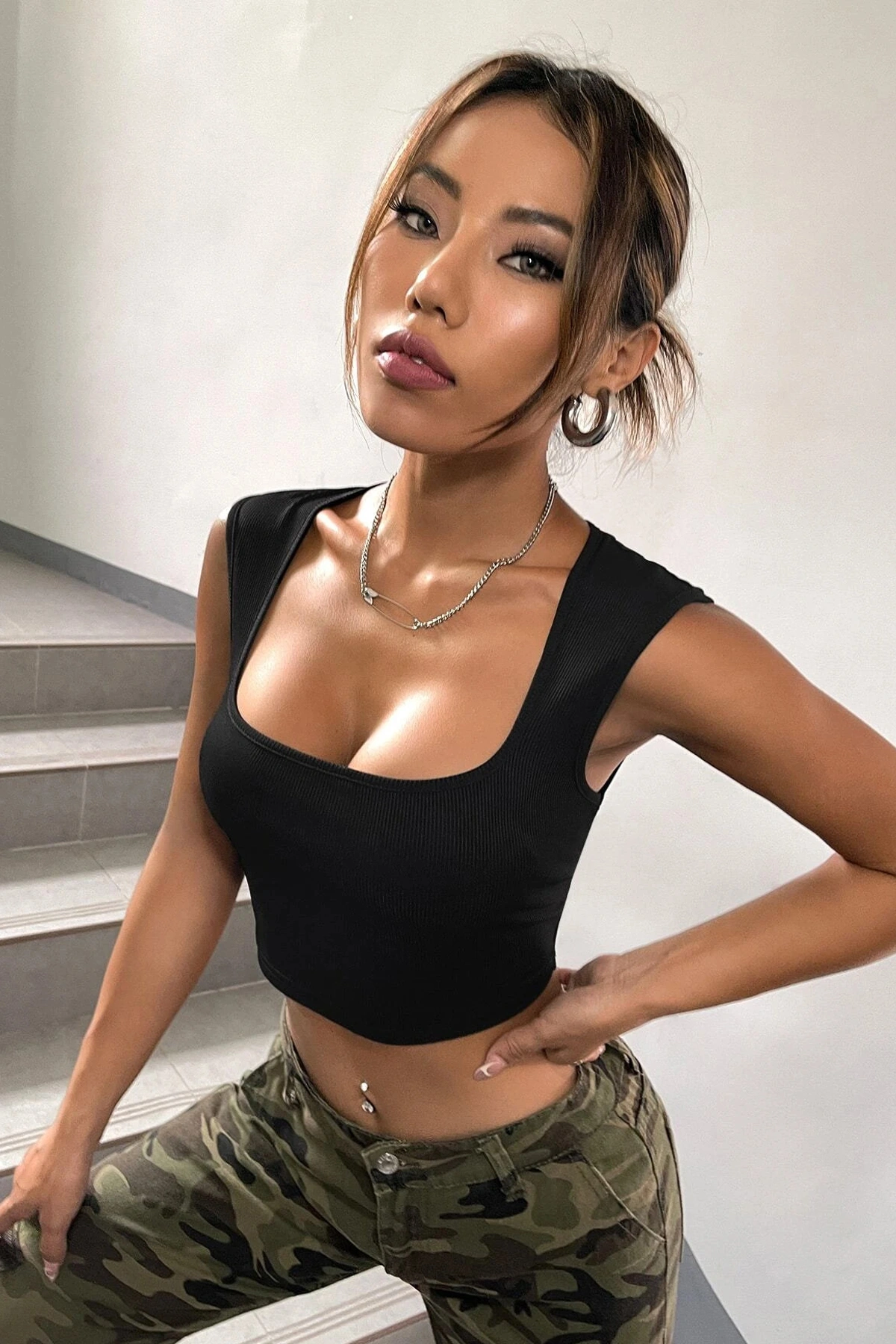 Kadın Siyah Kare Yaka Crop Top Bluz