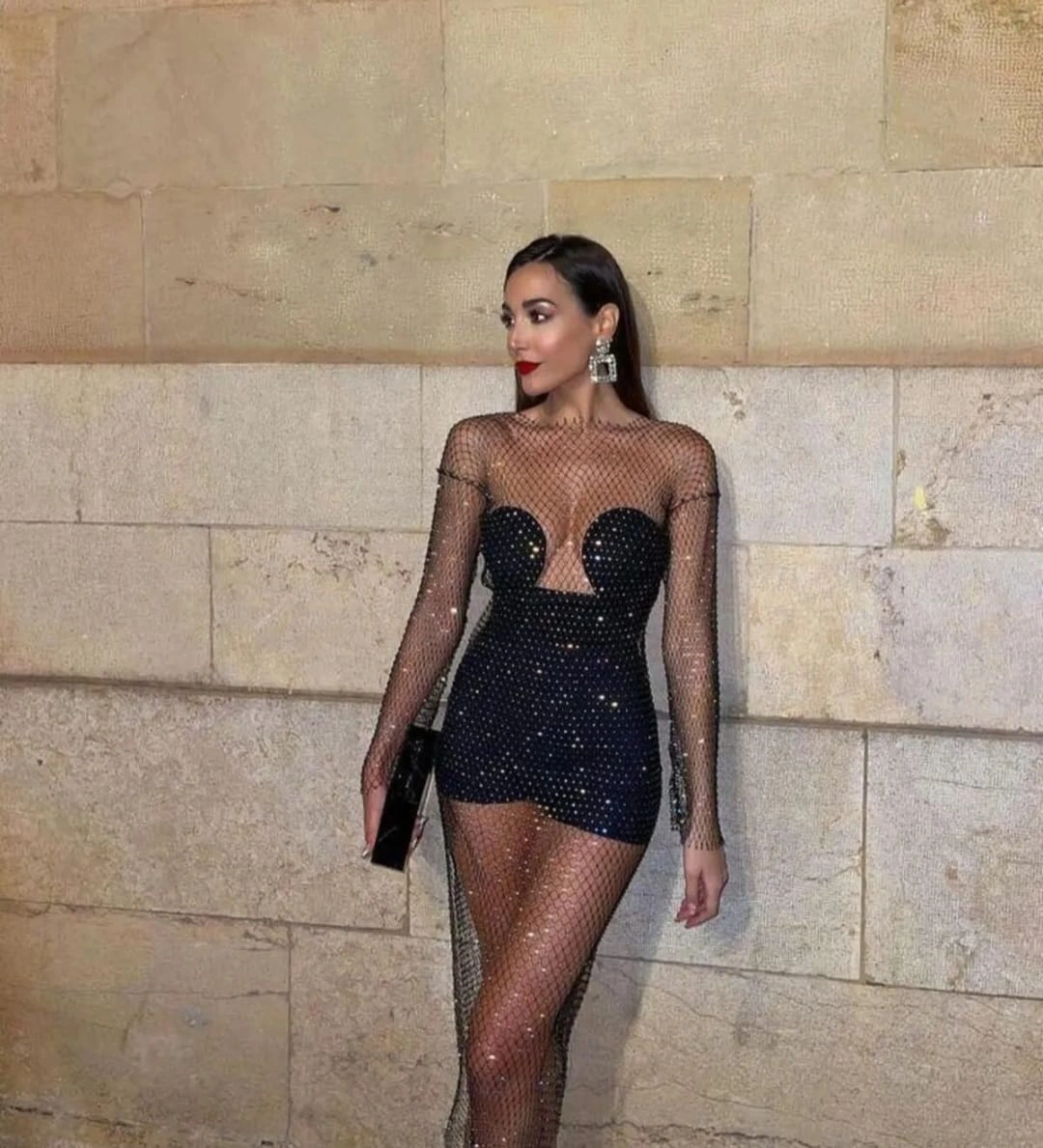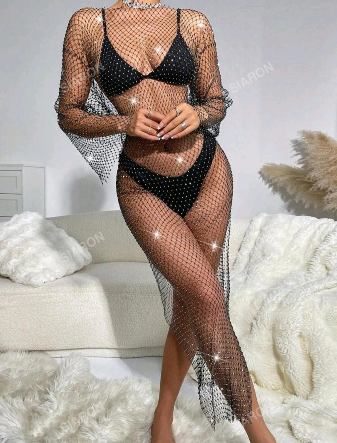 Kadın Siyah Kristal Taşlı File Elbise – Plaj Ve Gece Şıklığı İçin
