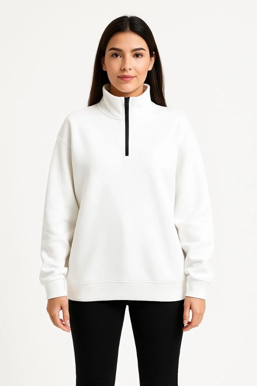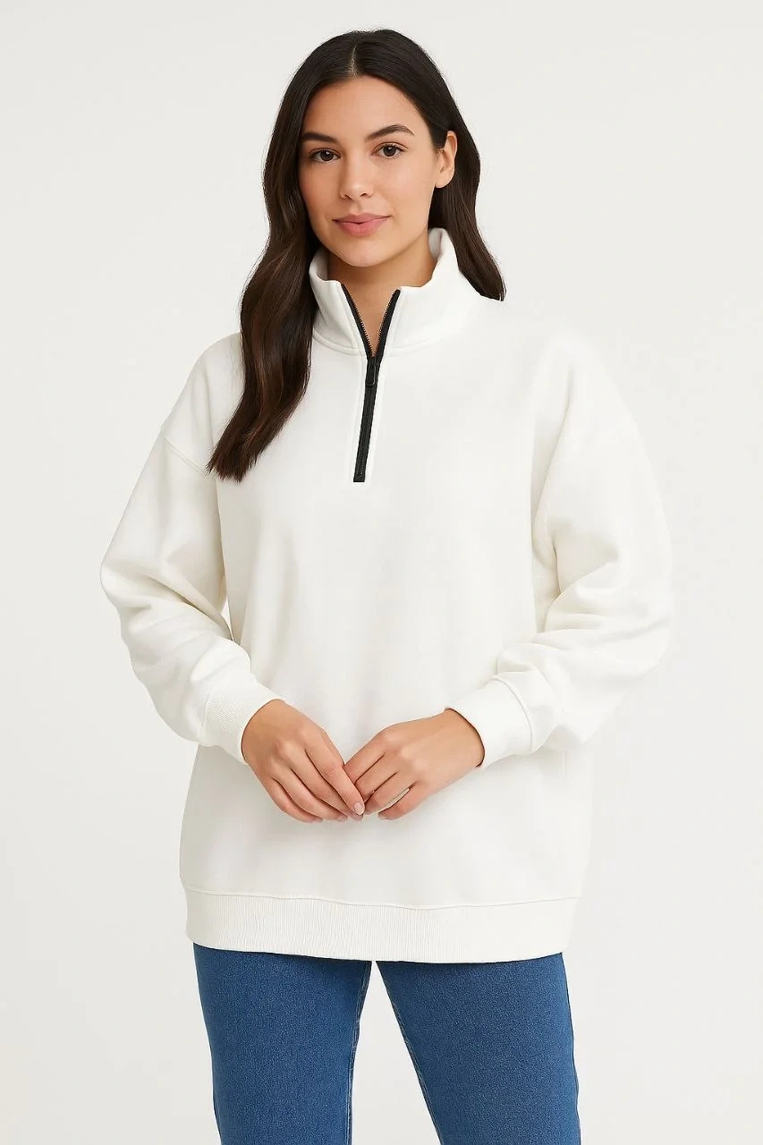 Kadın Üç İplik Dık Yaka Yarım Fermuarlı SweatShirt - Beyaz