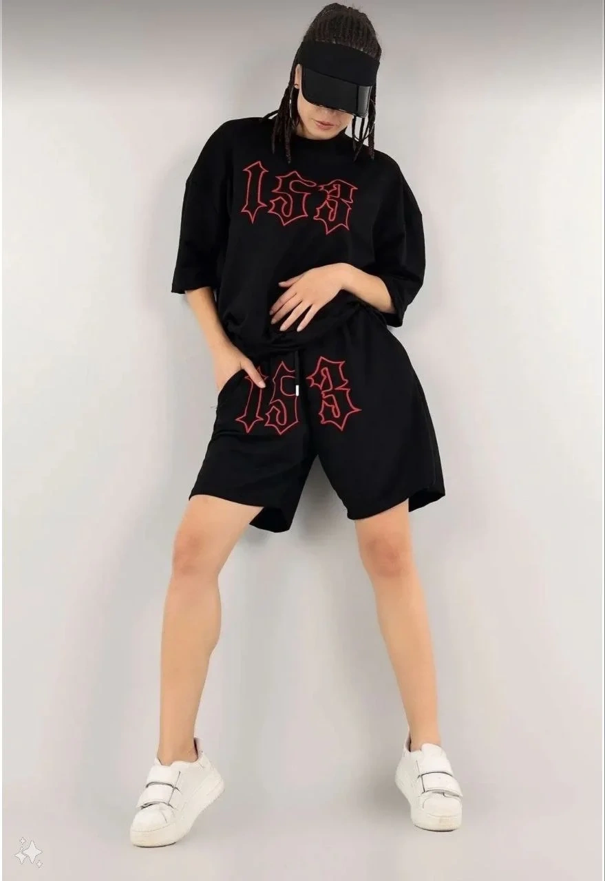 Kadın Unisex Nakış İşlemeli Şort Takım - Siyah