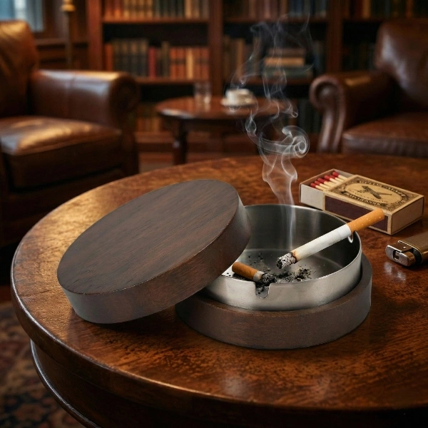 KAHVERENGİ BAMBU KAPAKLI KÜLLÜKÜrün ÖzellikleriKahverengi bambu kapaklı küllük, doğal ahşap görünümü ve modern tasarımıyla yaşam alanlarına şıklık katan fonksiyonel bir masaüstü ürünüdür. Ürünün dış gövdesinde kullanılan koyu tonlu bambu kapak, dekoratif bir görünüm sunarken aynı zamanda küllüğün kullanılmadığı anlarda kül ve koku yayılımını azaltmaya yardımcı olur. İç kısmında yer alan metal küllük haznesi, sigara külü ve izmaritlerin güvenli ve düzenli şekilde toplanmasını sağlar. Kapaklı tasarım sayesinde masa üzerinde daha temiz ve düzenli bir görüntü elde edilir. Küllük iç haznesinde bulunan sigara yerleştirme kanalları, kullanım sırasında sigaranın sabit durmasına katkı sağlar ve kül dökülmesini önler. 4x11 cm kompakt ölçüsü sayesinde masa, balkon, teras, ofis ve kafe gibi alanlarda yer kaplamadan rahatlıkla kullanılabilir. Metal iç haznesi temizlik işlemini pratik hale getirirken bambu kapak uzun süreli kullanım için dayanıklı bir yapı sunar. Hem estetik hem de kullanışlı bir küllük arayan kullanıcılar için ideal bir seçenektir.Paket İçeriği1 adet kahverengi bambu kapaklı küllük