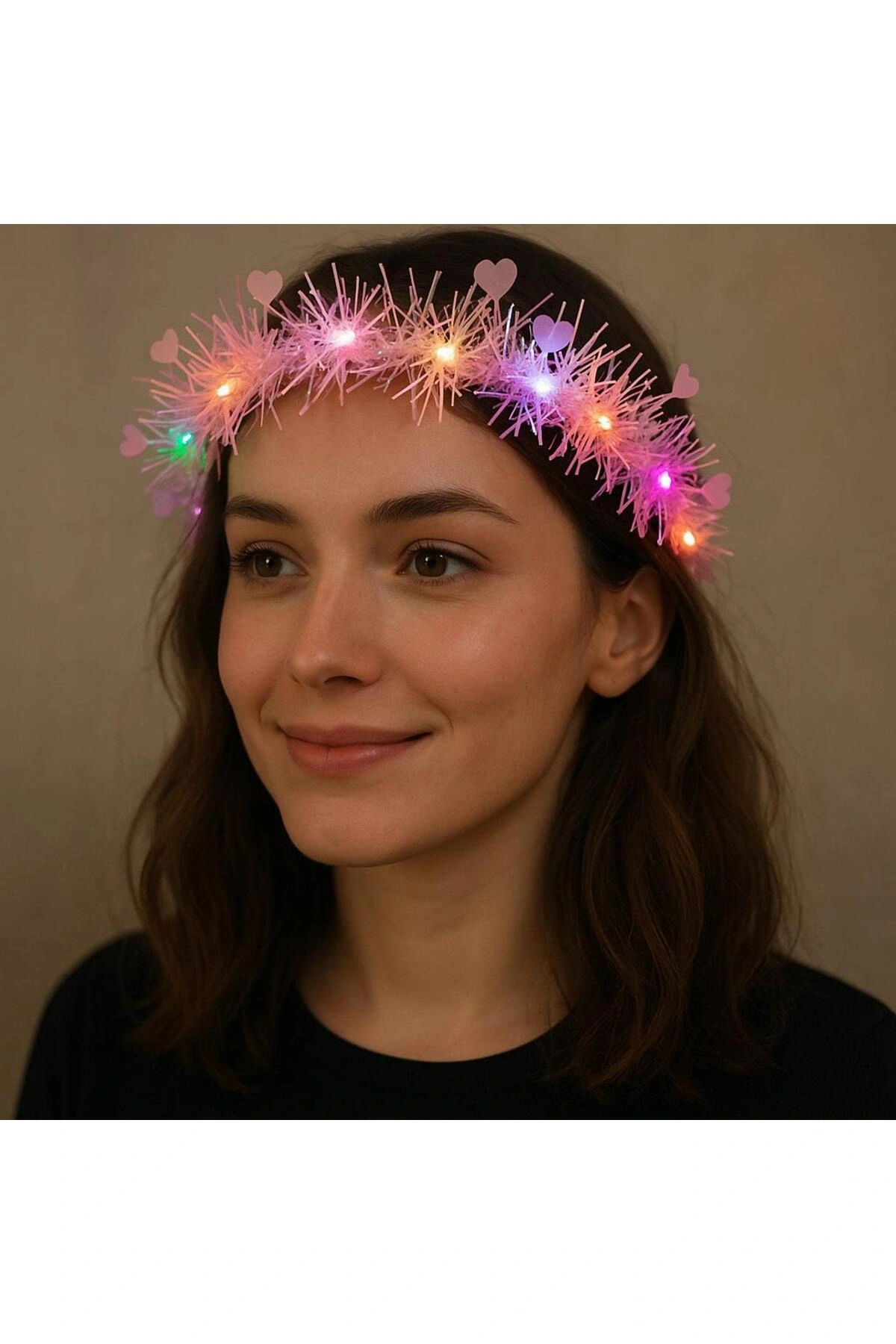 Gecenin en tatlı kızı olmaya hazır mısınız? "Kalp Püsküllü Gece Parıltısı 3 Modlu LED'li Işıklı Taç" ile her ortamda dikkatleri üzerinize çekin.; Pembe renginin masumiyeti, kalp püsküllerin romantik dokunuşu ve 3 farklı LED ışık moduyla bu taç, her özel anınıza tatlı bir ışıltı katacak.; Neden Bu Taç? Sevimli Pembe Rengi: Pembe simli teller ve kalp şeklindeki püsküller, tatlı ve romantik bir görünüm sunar.; 3 Modlu LED Işıklar: Sabit, yavaş yanıp sönen ve hızlı yanıp sönen olmak üzere 3 farklı ışık moduyla her ortama uyum sağlar.; Rahat ve Hafif Tasarım: Uzun süreli kullanımlarda bile rahatlık sunan hafif ve esnek yapı.; Çok Yönlü Kullanım: Doğum günü partileri, festivaller, konserler, kostüm partileri, Sevgililer Günü gibi özel günlerde veya sadece günlük kullanımda tarzınızı tamamlayacak mükemmel bir aksesuar.; Kolay Kullanım: Tek bir düğme ile kolayca açılıp kapanabilir ve ışık modları arasında geçiş yapılabilir.; Özellikler: Malzeme: Yüksek kaliteli simli teller, plastik kalp püsküller, LED ışıklar Renk: Pembe Işık Modları: 3 farklı mod (sabit, yavaş yanıp sönen, hızlı yanıp sönen) Güç: Pil ile çalışır (piller dahil) Boyut: Her kafa ölçüsüne uygun esnek yapı Kullanım Alanları: Doğum günü partileri Festivaller ve konserler Kostüm partileri Sevgililer Günü Özel davetler Günlük kullanımda tarzınızı tamamlamak için Paket İçeriği: 1 adet Kalp Püsküllü Gece Parıltısı 3 Modlu LED'li Işıklı Taç (Pembe Renk) Hemen sipariş verin ve gecenin en tatlı kızı olun!