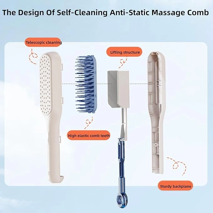 KENDİNİ TEMİZLEYEN SAÇ TARAĞI"Saçınıza Hak Ettiği Bakımı Verin - Her Tarakta Spa Hissi!"Kendi Kendini Temizleyen Anti-statik Masaj Tarağı:- Masaj Özelliği: Bu tarak, kafa derisine masaj yapabilen ve saçı nazikçe tedavi edebilen küçük yuvarlak parçacıklara sahiptir. Bu özellik sayesinde rahatlatıcı bir spa benzeri deneyim sunar.Ergonomik Tasarım:- Kullanım Kolaylığı: Basit ve şık bir görünüme sahip olan tarak, buzlu bir dokuya sahiptir ve ergonomik tutamağı ile rahat ve keyifli bir tarama deneyimi sağlar.Kullanımı Kolay:- Hızlı Temizlik: Geri çekilebilir döner kaldırma mekanizması sayesinde tarak, 1 saniyede saçları temizler. Sadece kolu döndürerek hava yastığının tüm saç ve döküntüleri serbest bırakmasını sağlayabilirsiniz. Bu özellik kepek ve kuru saç derisini tedavi ederek kafa derisi sağlığını ve saç büyümesini destekler.Tüm Saç Tipleri için Uygun:- Çok Yönlülük:Saça nazikçe nüfuz eder, en düğümlü düğümleri kolayca çözer ve tüm saç tiplerine uygundur. Düz saçlar, kıvırcık saçlar, ince saçlar, kalın saçlar, zarar görmüş saçlar, peruk ve uzatılmış saçlar için ideal bir taraktır.Kullanım Alanları- Günlük Kullanım: Her türlü saç tipi ve ihtiyacı için günlük kullanıma uygun.- Saç Bakımı ve Şekillendirme: Hem saç bakımında hem de saç şekillendirmede rahatlıkla kullanılabilir.- Masaj ve Rahatlama:Kafa derisine masaj yaparak rahatlama ve konfor sağlar.Paket İçeriği1 adet kendini temizleyen saç tarağı