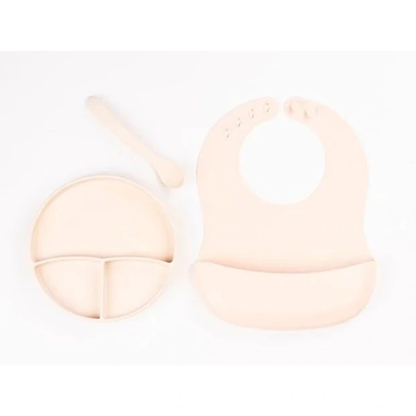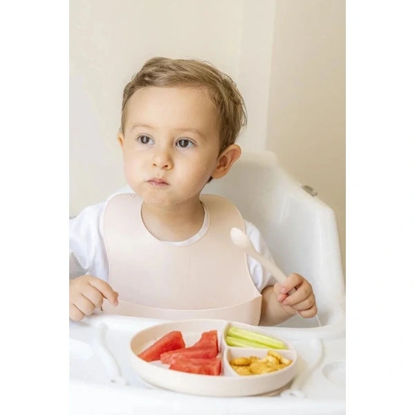KREM RENGİ 3’LÜ SİLİKON YEMEK SETİ – ÖNLÜK + DİŞ KAŞIYICILI KAŞIK + VAKUMLU TABAKÜrün ÖzellikleriKrem rengi 3’lü silikon yemek seti, bebeklerin beslenme saatlerini daha keyifli ve güvenli hale getirmek için tasarlanmıştır. Kaymaz tabanlı vakumlu tabak, sabit durarak yiyeceklerin dökülmesini önler ve 3 bölmeli yapısı sayesinde farklı besinlerin ayrı ayrı sunulmasına imkan tanır. Yumuşak uçlu diş kaşıyıcılı silikon kaşık, miniklerin hassas diş etlerine zarar vermez ve aynı zamanda diş çıkarma döneminde kaşıyıcı olarak kullanılabilir. Ayarlanabilir mama önlüğü, 4 farklı boy seçeneği ve çift kilit sistemi ile bebeğinizin hareketlerine uyum sağlar. Geniş haznesi dökülen yiyecekleri yakalayarak çevrenin temiz kalmasını sağlar.%100 güvenli ve sağlıklı silikon malzemeden üretilmiştir. Lateks içermez, alerji riski taşımaz, dayanıklı, elastik ve kırılmaz yapısıyla uzun süre kullanım sunar. Düşük ısı iletkenliği sayesinde güvenli bir deneyim sağlar. Hem elde hem de bulaşık makinesinde yıkanabilir ve renkleri solmadan uzun ömürlüdür.Paket İçeriği1 adet vakumlu 3 bölmeli tabak1 adet diş kaşıyıcılı silikon kaşık1 adet ayarlanabilir silikon mama önlüğü