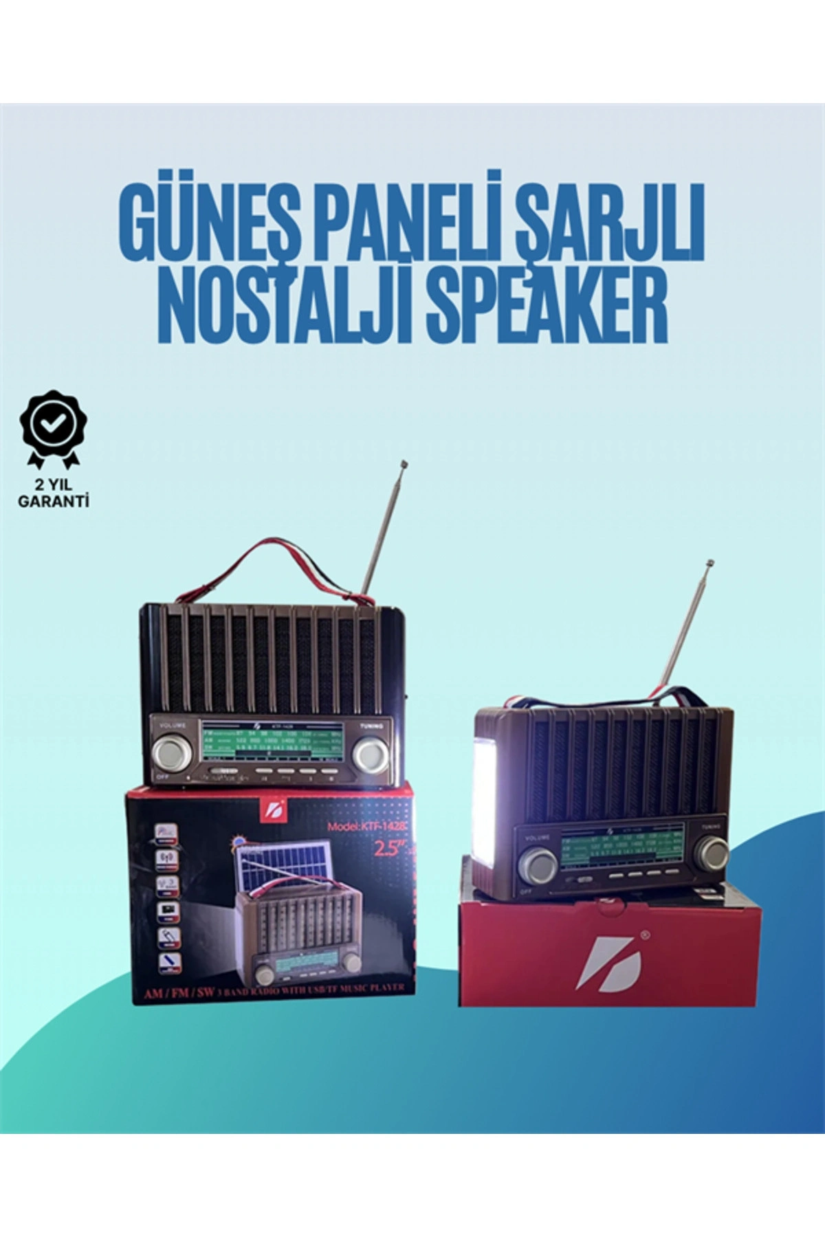 KTF-1428, nostaljik estetikte ama günümüz ihtiyaçlarına hitap eden çok yönlü bir müzik cihazıdır.; Solar paneli sayesinde şarj sorununu ortadan kaldırır.; İster USB bellek, ister SD kart, isterseniz Bluetooth bağlantısıyla müzik dinleyin – her senaryo için hazırdır.; FM/AM/SW üçlü radyo sistemiyle yerel ve uzak yayınlara erişim sağlayabilir, sesi net ve güçlü şekilde alabilirsiniz.; 18650 akü ile çalışan cihaz, DC (6V) veya AC (220V) ile de şarj edilebilir.; AUX kablosu ile eski müzik çalarları bağlayabilir, bilgisayar veya telefondan da kablolu müzik aktarabilirsiniz.; Evinizde elektrik kesilse bile bu cihazla müzik kesilmez!