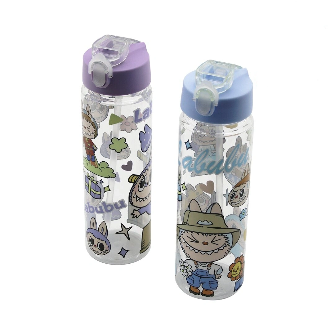 LABUBU ÇOCUK ÇİZGİ FİLM KARAKTER RESİMLİ SU MATARASI ŞEFFAF PLASTİK PİPETLİ KİLİTLİ KAPAK (5324)