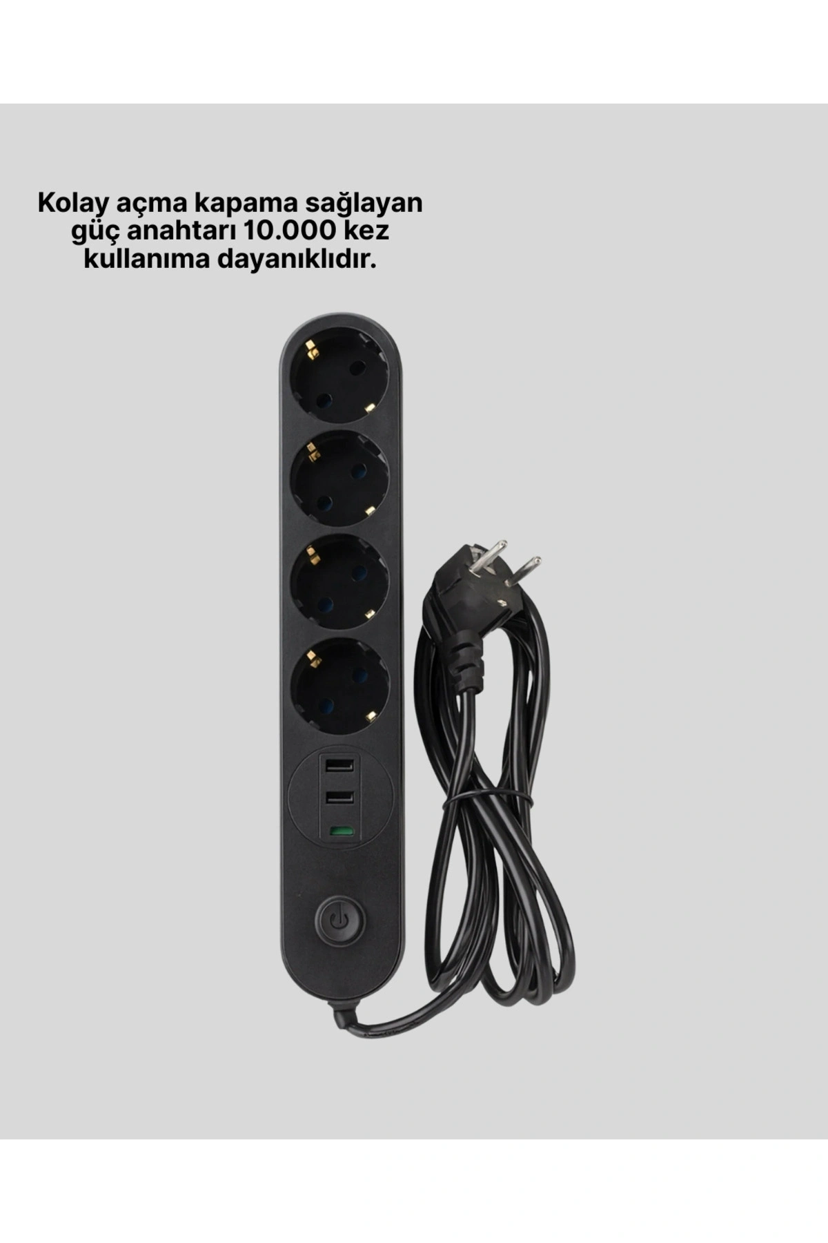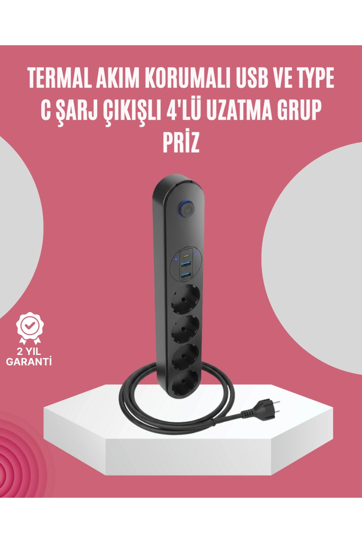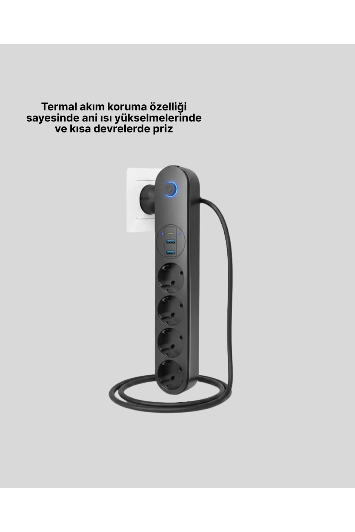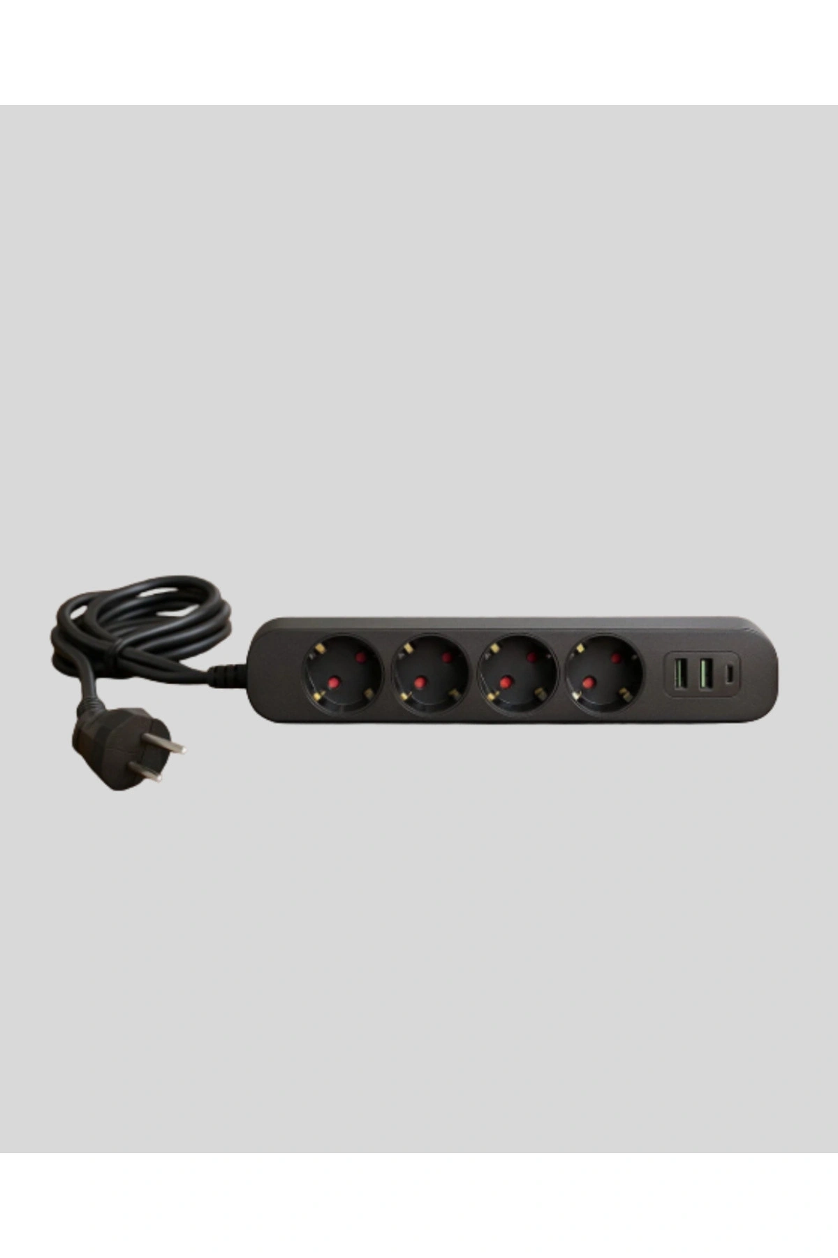 4 prizli USB ve Type-C çıkışlı çoklu priz, güvenli enerji dağıtımı ve şarj ihtiyaçlarını tek noktada toplar.; 2 USB ve 1 Type-C portu sayesinde akıllı cihazlarınızı hızlı ve düzenli şekilde kullanabilirsiniz.; Adaptör karmaşasını ortadan kaldıran tasarımıyla çalışma alanlarında düzen sağlar.; Akıllı akım dengeleme sistemi, bağlı cihazları otomatik olarak tanır ve enerji ihtiyacına göre akımı ayarlar.; Bu özellik, batarya sağlığını korurken aynı zamanda enerji verimliliği sağlar.; Termal ve kısa devre koruması, ani elektriksel sorunlara karşı üst düzey güvenlik sunar.; Yüksek ısıya dayanıklı PC-ABC gövde yapısı, uzun süreli kullanımda deformasyon riskini azaltır.; 20.000 kez tak-çıkar dayanımına sahip priz yuvaları ve 10.000 aç-kapa ömürlü güç anahtarı, ürünün kalitesini ortaya koyar.; 2 metre kablo uzunluğu, farklı yerleşim ihtiyaçlarına kolayca uyum sağlar.; Led göstergeli anahtar, prizlerin aktifliğini net şekilde gösterir.; Siyah renkli sade tasarımı, hem ev hem ofis ortamlarında şık bir görünüm sunar.; Bilgisayar, televizyon, yazıcı, hoparlör ve diğer tüm elektronik cihazlarla uyumludur.