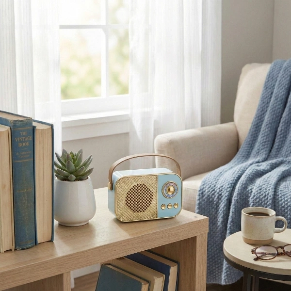 LED AYDINLATMALI HOPARLÖR MAVİÜrün ÖzellikleriLED Aydınlatmalı Hoparlör Mavi, retro tasarımı modern ses teknolojisi ile buluşturan özel bir hoparlördür. Pastel mavi rengi ve altın detaylı şık gövde yapısı ile hem dekoratif bir obje hem de günlük kullanımda güçlü bir ses kaynağı olarak öne çıkar. Bluetooth 5.2 teknolojisi sayesinde hızlı ve stabil bağlantı sunarak tüm cihazlarla sorunsuz bir şekilde eşleşir. USB ve TF kart girişleriyle kablosuz bağlantıya ihtiyaç duymadan da müzik çalma imkânı tanır ve kullanıcıya yüksek seviyede özgürlük sağlar.LED aydınlatma detayı, hoparlöre hem estetik hem de ambiyans sağlayan hoş bir ışık efekti kazandırır. Özellikle akşam kullanımında ortama sıcak bir atmosfer katan LED halkası, dekoratif görünümünü güçlendirir. Hafif ve taşınabilir yapısı, taşıma sapı ile birleştiğinde evde, ofiste, balkonda, bahçede veya dış mekânda kolayca kullanılabilir. Müzik dinlemeyi keyifli hale getiren bu hoparlör, aynı zamanda hediye olarak da oldukça tercih edilir.Güçlü ve net ses çıkışı ile boyutunun ötesinde bir performans sunarken, pratik kontrol tuşları sayesinde herkes tarafından rahatlıkla kullanılabilir. Estetik tasarımı ve fonksiyonelliği bir araya getiren bu model, günlük hayatınıza hem stil hem de konfor katar.Paket İçeriği1 Adet LED Aydınlatmalı Bluetooth Hoparlör Mavi