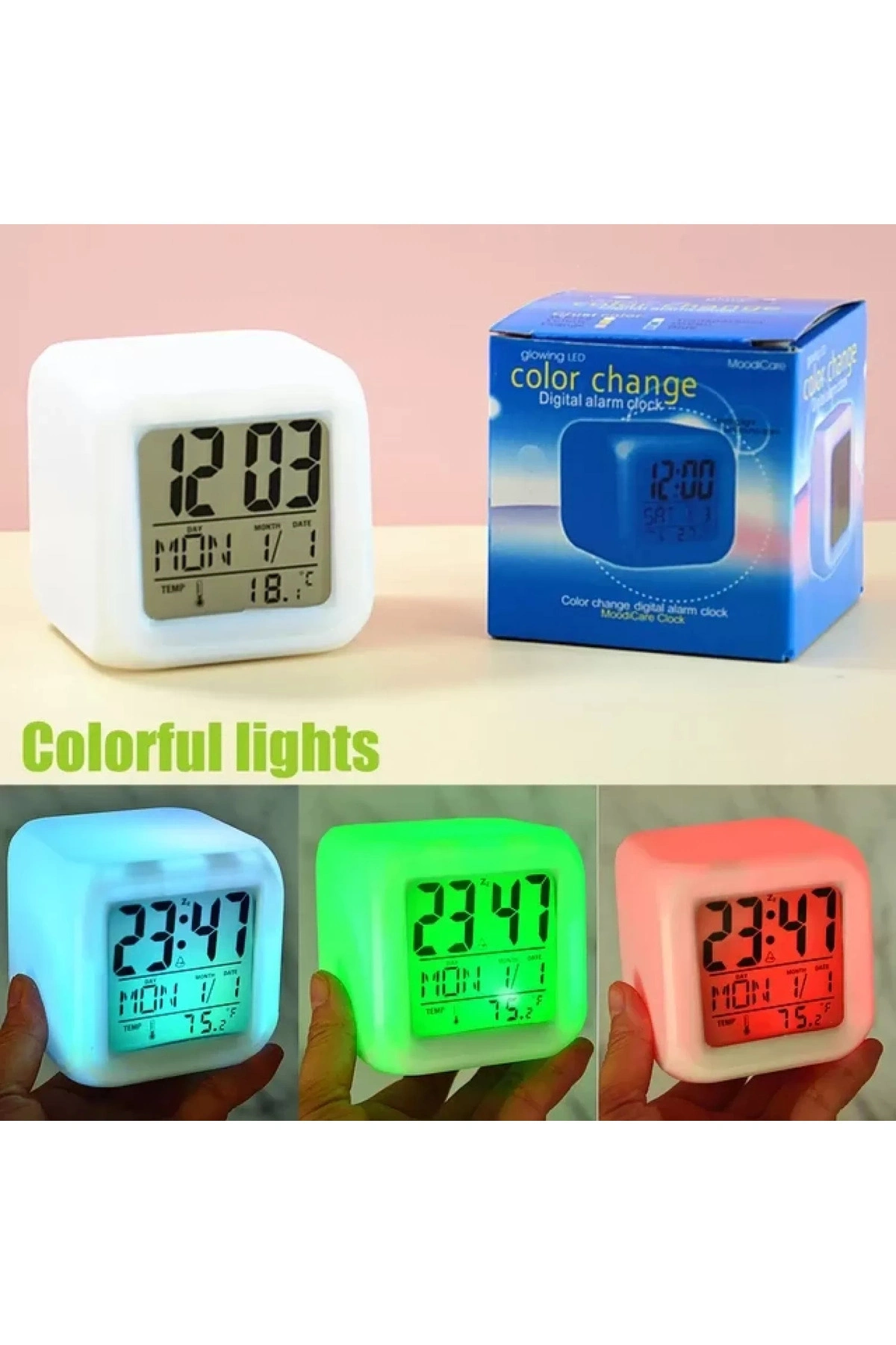 Renk Değiştiren Alarmlı Dijital Küp Masa Saati Komple Renk Değiştirir. Takvim Ve Termometre ve Kronometre Gibi Özelliklere Sahiptir. Ayarladığınız Zamanda Alarm Çalar.