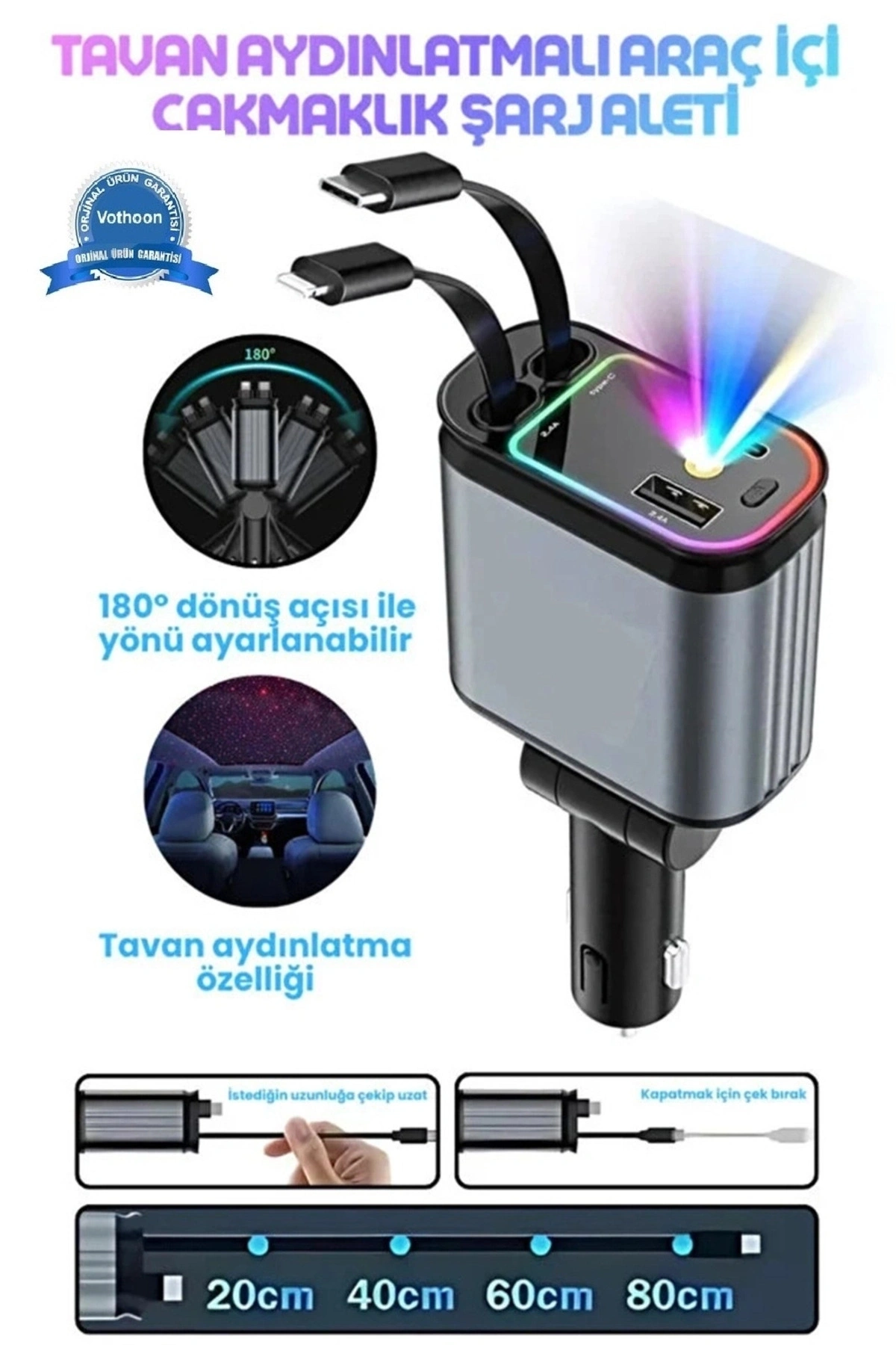 66W Ultra Hızlı Araç Şarj Cihazı: 4’ü 1 Arada Geri Çekilebilir & Tavan AydınlatmalıAracınızdaki kablo karmaşasına son verin ve şarj deneyiminizi bir üst seviyeye taşıyın 66W Süper Hızlı Araç Şarj Aleti, sadece cihazlarınızı şarj etmekle kalmaz, üzerindeki Yıldızlı Gökyüzü LED Projeksiyonu ile aracınızın tavanına estetik bir atmosfer katar.; Hem fonksiyonel bir teknoloji harikası hem de şık bir aksesuar arayanlar için tasarlandı.; Öne Çıkan Fonksiyonel Özellikler1. 4'ü 1 Arada Çoklu Şarj İstasyonuArtık araçta "sıra bekleme" devri kapandı.; Bu cihaz aynı anda 4 farklı cihazı şarj edebilir:Geri Çekilebilir Type-C Kablo: 66W PD desteği ile laptop ve yeni nesil telefonlar için süper hızlı şarj.; Geri Çekilebilir iOS Kablo: iPhone modelleri için güvenli ve hızlı dolum.; Ek USB-A ve USB-C Portları: Harici kablolarınızla diğer aksesuarları şarj etme imkanı.2. Akıllı Geri Çekilebilir Kablo Tasarımı (80 cm)Kabloların birbirine dolanmasından bıktınız mı? Her biri 80 cm uzunluğa sahip makaralı kabloları ihtiyacınız kadar çekin, işiniz bittiğinde hafifçe çekip bırakın otomatik olarak yuvasına dönsün.; Aracınız her zaman düzenli ve temiz kalsın.3. 180 Derece Hareketli BaşlıkŞarj fişi sağa ve sola 180 derece ayarlanabilir yapıdadır.; Bu sayede çakmaklık girişinin konumuna göre cihazı en uygun açıya getirebilir, engebeli yollarda ve sarsıntılarda bağlantı kopması yaşamazsınız.4. Tavan Aydınlatmalı Yıldız EfektiCihazın üst kısmında bulunan özel LED sistemi, aracınızın tavanına yıldızlı bir gökyüzü yansıtır.; Gece sürüşlerinde hem şık bir ambiyans oluşturur hem de şarj portlarını kolayca bulmanızı sağlar.; Teknik Özellikler TablosuÖzellikDetayToplam Güç66W (Süper Hızlı Şarj Destekli)Giriş Voltajı12V - 24V DC (Otomobil ve Kamyon Uyumlu)Kablo Uzunluğu80 cm (Geri Çekilebilir Mekanizma)Çıkış PortlarıType-C Kablo, Lightning Kablo, USB-A Port, USB-C PortGüvenlik SertifikasıAşırı Isınma, Kısa Devre ve Yüksek Akım KorumasıÖzel ÖzellikLED Yıldızlı Gökyüzü Tavan AydınlatmasıNeden Bu Ürünü Tercih Etmelisiniz?Geniş Uyumluluk: iPhone, Samsung, , Huawei tablet ve hatta düşük güç tüketen dizüstü bilgisayarlar ile tam uyum.; Güvenli Şarj: Akıllı çip teknolojisi sayesinde cihazınızın ihtiyacı olan akımı otomatik algılar ve batarya sağlığını korur.; Düzenli Kokpit: Torpido gözünde veya vites çevresinde sarkan kablo kirliliğine son verir.