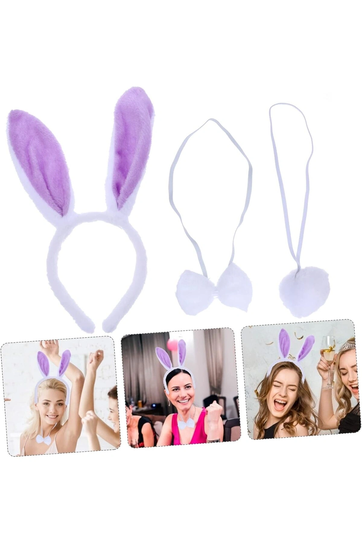 Partinin En Sevimli Tavşanı Olun! Masalsı bir görünüme hazır mısınız? Lila Mor Tavşan Kulak Papyon Kuyruk 3'lü Set, Paskalya partilerinden temalı doğum günlerine,kostümlü etkinliklere kadar her ortamda dikkatleri üzerinize çekmeniz için tasarlandı.; Bu sevimli tavşan kostümü seti ile anında eğlenceli ve büyüleyici bir karaktere bürüneceksiniz! Ürün Detayları ve Özellikleri Eşsiz Lila (Mor) Renk: Standart beyaz kulaklardan sıkılanlar için ideal.; Kulakların iç kısmı canlı lila/mor renkte yumuşak peluş kumaşla kaplıdır.; 3 Parça Tam Set: Tek bir ürünle eksiksiz bir görünüme ulaşın: Tavşan Kulak Bandı: Esnek ve rahat kullanıma uygun, tüy kadar hafif bant.; Beyaz Papyon: Boyun askılı, zarif ve parlak saten görünümlü papyon.; Ponpon Kuyruk: Beyaz renkte, kostüme kolayca takılabilen sevimli ponpon tavşan kuyruğu.; Mükemmel Uyum: Hem çocuklar hem de yetişkinler için uygundur.; Esnek yapısı sayesinde her kafa yapısına kolayca uyum sağlar.; Yüksek Kaliteli Malzeme: Yumuşak ve kaliteli peluş kumaş, uzun süreli konforlu kullanım sunar.; Kullanım Alanları Bu çok yönlü parti malzemesi, aşağıdaki etkinlikler için vazgeçilmeziniz olacak: Doğum Günü Partileri ve Temalı Etkinlikler Cosplay Etkinlikleri ve Fuar Ziyaretleri Okul Gösterileri ve Sahne Performansları
