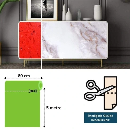 Mermer görünümlü folyoyu dilediğiniz yere kolayca yapıştırabilir ve sonrasında leke olmadan ürünü çıkarabilrsiniz.