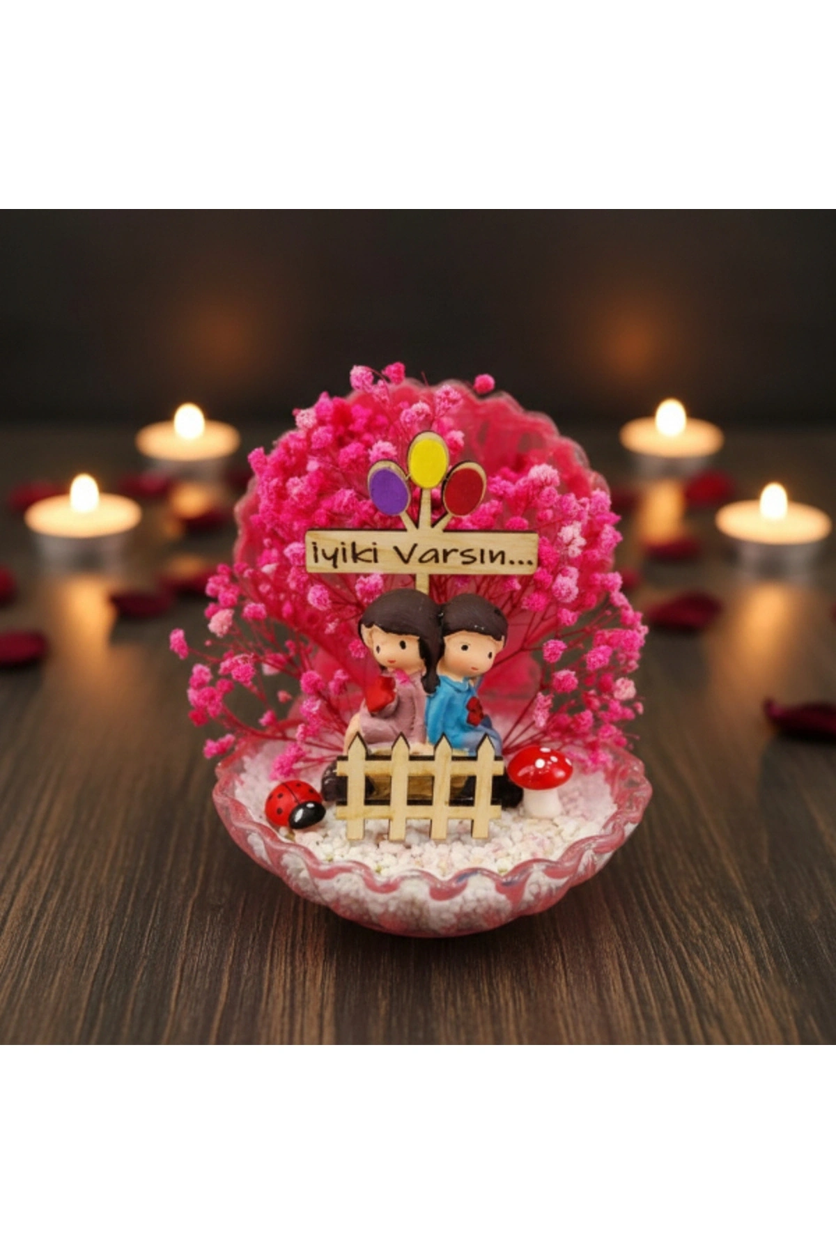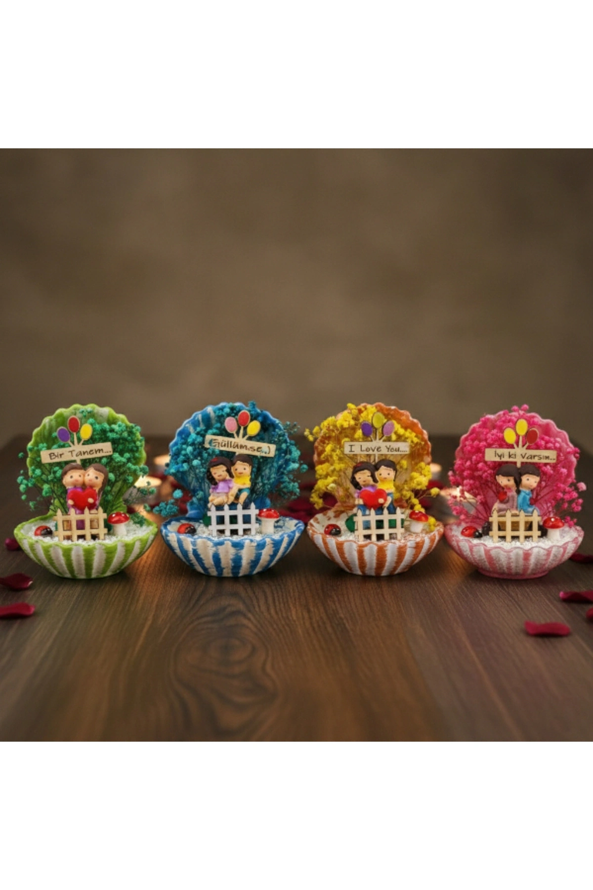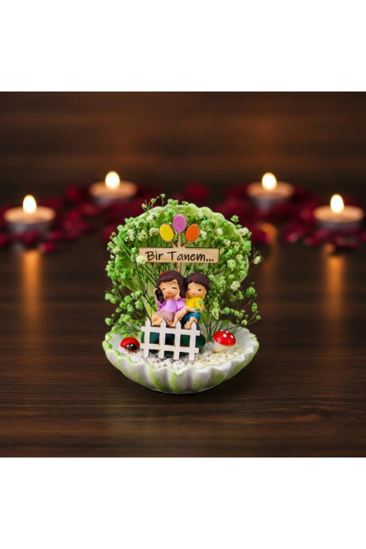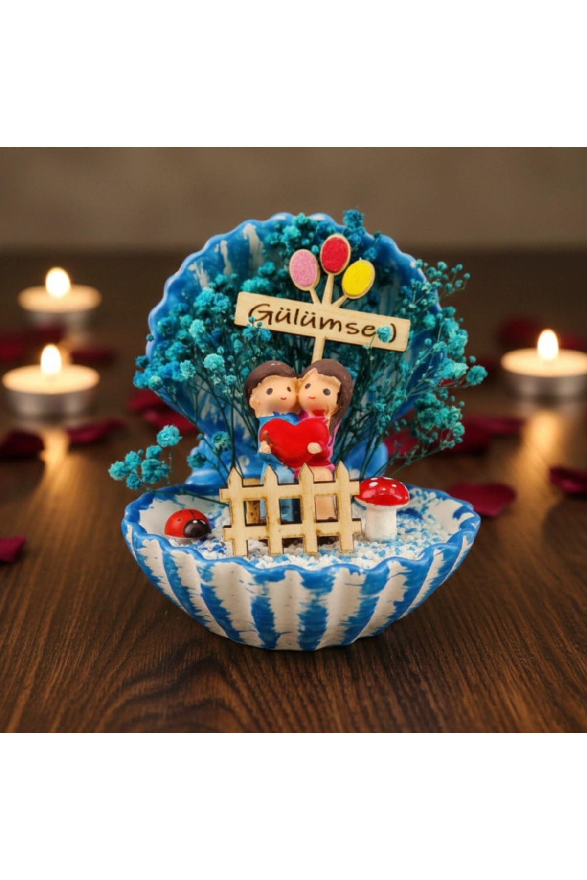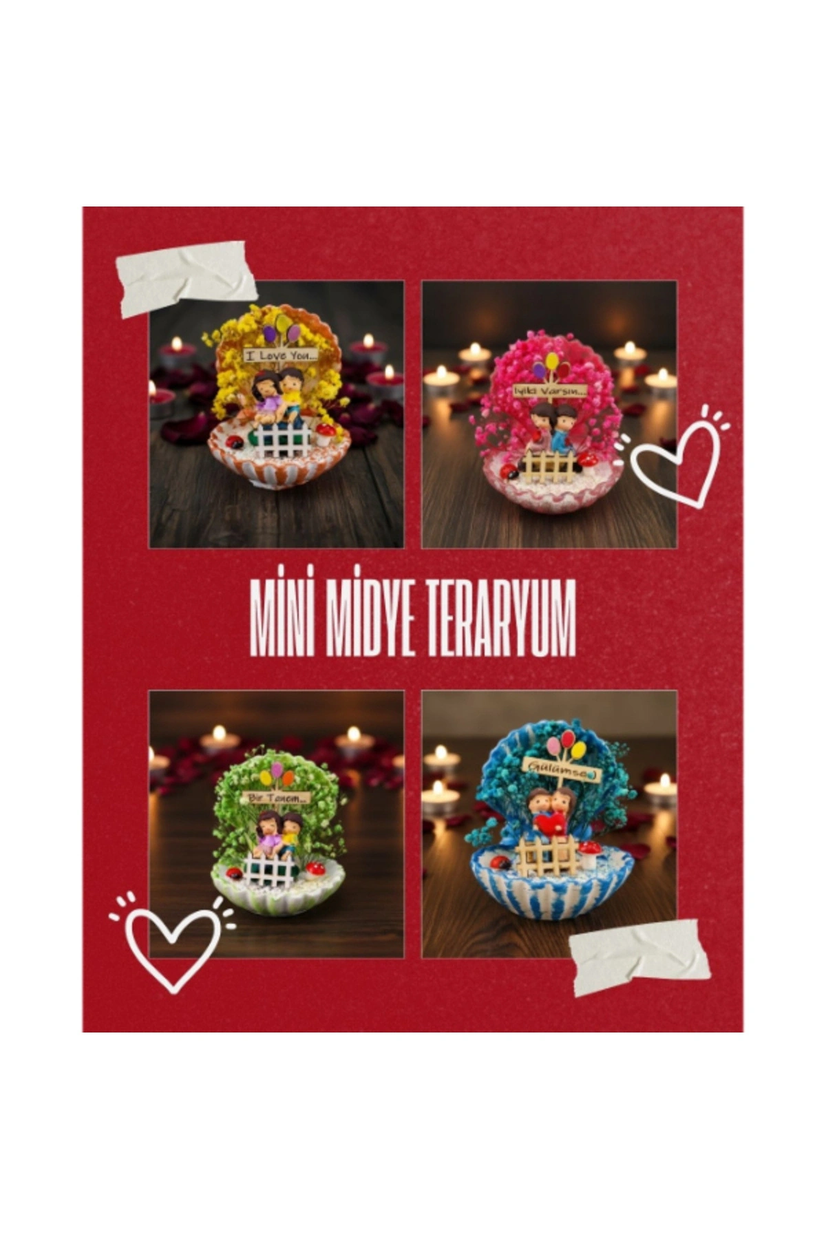 MİNİ MİDYE TERARYUM – ÖZEL GÜN HEDİYESİÜrün ÖzellikleriMini midye teraryum, sevimli figürleri ve canlı renkleriyle özel günlerde duyguları en sıcak şekilde yansıtan dekoratif bir üründür. Midye formundaki tasarımı, içerisindeki minyatür sahneyi estetik biçimde sergileyerek masa ve raf üzerinde dikkat çekici bir görünüm oluşturur. Renkli yosun dokuları ve figür detayları sayesinde bulunduğu ortama neşe ve canlılık katan bu model, hem modern hem de eğlenceli dekorasyon tarzlarına uyum sağlar. Kompakt yapısı sayesinde küçük alanlarda dahi rahatlıkla kullanılabilen ürün, özellikle dekoratif mini teraryum arayanlar için ideal bir tercihtir. Sevgililer günü, doğum günü ve yıl dönümü gibi özel anlarda anlamlı bir seçenek sunan bu teraryum, şık sunumu ile hediyelik olarak da öne çıkar. Model seçimi yapılamayan ürün, görsellerde yer alan tasarımlardan biri olacak şekilde karışık model gönderimi yapılmaktadır.Ürün Teknik Özellikleri Özellik Açıklama Ürün Adı Mini Midye Teraryum Tasarım Midye formunda dekoratif teraryum İçerik Minyatür figürler ve renkli yosun detayları Model Karışık gönderilir Kullanım Alanı Masa, raf, ofis, vitrin Kullanım Amacı Dekoratif ve hediyelik Paket İçeriği1 adet mini midye teraryum
