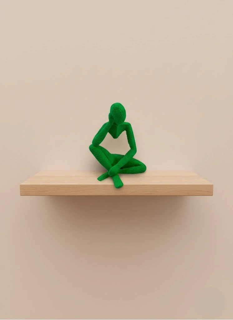 Yeşil insan figürü biblo, düşünceli pozuyla dekorasyona karakter katar. Küçük boyutları sayesinde dar alanlarda bile şık bir tamamlayıcı olarak kullanılabilir. Evde, ofiste veya çalışma alanlarında masa üstü ya da raf dekoru olarak tercih edilebilir. Minimal tasarımı, loş ya da aydınlık ortamlarda estetik bir duruş sergiler ve dekorasyona modern bir hava kazandırır.