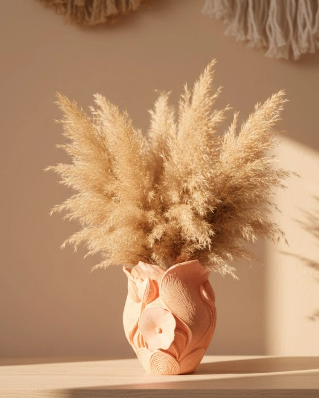 Turuncu tonun enerjisi ile tasarlanmış bu çiçek kabartmalı vazo, iç mekân dekorasyonunda farklılık yaratmak isteyenler için idealdir. 3D üretim tekniği sayesinde detaylar net ve belirgindir. Kuru çiçek veya yapay bitkiler ile kombinlenebilir.