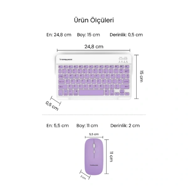 MOR KABLOSUZ KLAVYE VE MOUSE SETİÜrün ÖzellikleriMor Kablosuz Klavye ve Mouse Seti, modern tasarımı ve göz alıcı rengiyle çalışma alanına şık bir görünüm kazandırır. Kablosuz bağlantı teknolojisi sayesinde bilgisayar, telefon ve tablet gibi cihazlarla uyumlu bir kullanım sunar. Türkçe Q düzenindeki multimedya klavyesi yazı yazmayı kolaylaştırırken fonksiyon tuşlarıyla pratik ve hızlı erişim sağlar. Hem klavye hem de mouse üzerinde bulunan Type-C şarj girişleri hızlı ve güvenilir şarj imkânı sunarak uzun süreli kullanımda kesintisiz performans sağlar. Hafif ve kompakt yapısı kolay taşınabilirlik sağlarken ergonomik mouse tasarımı uzun süreli kullanımda bile elinizi yormadan rahat bir tutuş sunar. Estetik tasarımı ve güçlü bağlantı yapısı ile hem günlük kullanım hem de profesyonel çalışma ortamları için ideal bir settir.Paket İçeriği1 Adet Mor Kablosuz Klavye Ve Mouse Seti