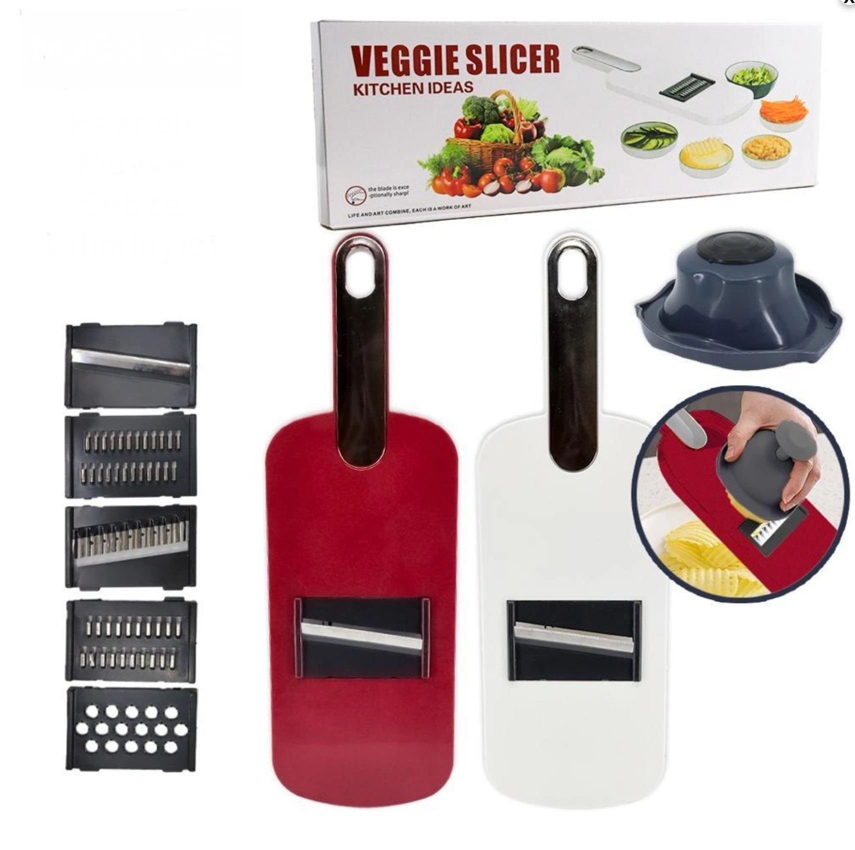 MULTİFONKSİYONEL MUTFAK RENDE SETİVeggie Slicer Multifonksiyonel Mutfak Rende Seti mutfakta işlerinizi kolaylaştırmak için tasarlanmış çok yönlü bir mutfak rendesi. Beş farklı doğrama başlığı sayesinde sebzelerinizi veya meyvelerinizi istediğiniz şekilde hazırlayabilirsiniz. Üstelik, rendelerken güvenliği artırmak için elinizi korumak için özel bir el koruyucu aparatı da bulunuyor. Pratik ve kullanışlı yapısıyla Veggie Slicer, mutfakta zaman kazandırırken aynı zamanda güvenli bir kullanım sağlıyor.Paket İçeriği1 adet multifonksiyonel mutfak rende seti veggie slicer