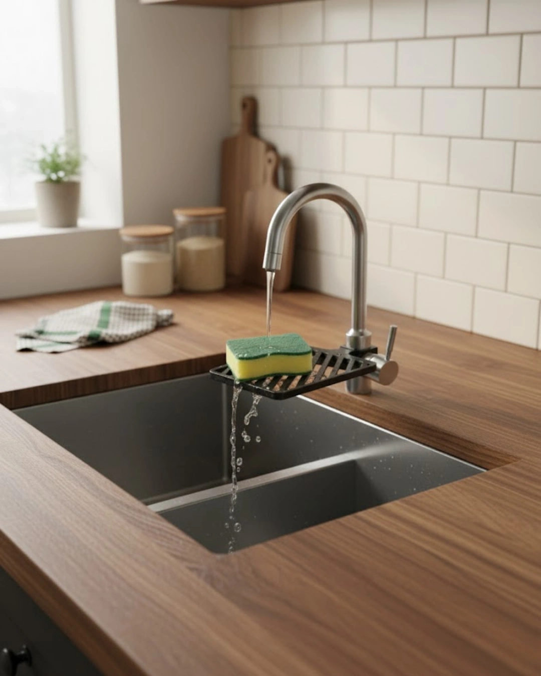 Mutfakta düzenli bir görünüm elde etmek isteyenler için tasarlanan musluk üstü sünger tutucu organizer, tezgâh karmaşasını ortadan kaldıran akıllı bir çözümdür. Bulaşık süngerleri genellikle tezgâh üzerinde, lavabonun kenarında ya da uygunsuz askılarda bekletilir. Bu durum hem görsel olarak rahatsız edici hem de hijyen açısından risklidir. Bu organizer, süngerinizi musluğun hemen yanında, sabit bir platform üzerinde konumlandırarak düzenli bir kullanım sunar. Ürün, musluğun gövdesine monte edilmiş birleşik tasarımıyla dikkat çeker. Ayrı bir aparat gibi durmaz; musluğun doğal bir parçasıymış gibi estetik bir bütünlük sağlar. Platform yapısı sayesinde sünger dengeli şekilde durur ve kayma yapmaz. Alt kısmındaki drenaj kanalları, yıkama sonrası süngerden akan suyun lavaboya yönlendirilmesini sağlar ve süngerin daha kısa sürede kurumasına yardımcı olur. Tezgâh üstünde alan açmak isteyen kullanıcılar için büyük avantaj sağlar. Küçük mutfaklarda, dar evyelerde ya da minimal dekorasyon tercih edilen alanlarda oldukça kullanışlıdır. Dağınık görüntüyü ortadan kaldırarak mutfağınızın daha temiz ve düzenli görünmesine katkı sağlar. Modern çizgilere sahip sade tasarımı sayesinde her mutfak stiline uyum sağlar. Günlük kullanıma uygun sağlam yapısı, ürünü uzun süre güvenle kullanmanıza olanak tanır. Sünger dışında küçük temizlik bezleri veya fırçalar için de pratik bir alan oluşturabilir. Kolay temizlenebilir yüzeyi sayesinde ekstra bakım gerektirmez. Günlük mutfak işlerinizi daha hijyenik, düzenli ve konforlu hale getirmek isteyenler için ideal bir mutfak aksesuarıdır.
