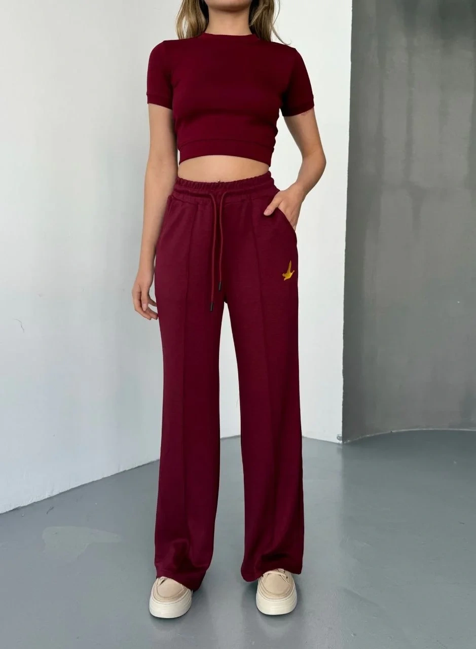 • Osy Modal Yumuşak Dokulu Kumaş Nakış işlemeli Rahat Bol Paça Eşofman Pantalon - Bordo