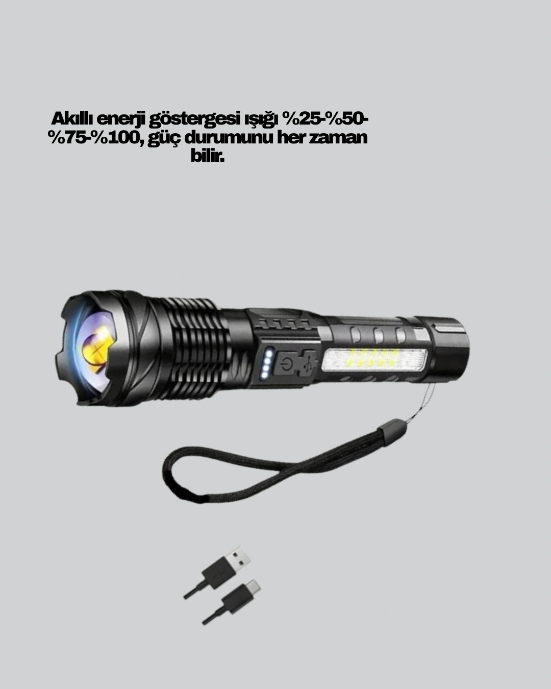 Bu LED el feneri, yüksek performanslı ışık çıkışı ile profesyonel ve günlük kullanım için uygundur. Ana ışık uzun mesafe aydınlatma sağlarken, yan COB LED geniş alanları aydınlatmak için idealdir. Kompakt yapısı sayesinde çanta veya araç içerisinde kolayca taşınabilir. Şarjlı olması sayesinde her zaman kullanıma hazırdır. Acil durumlar ve elektrik kesintilerinde güvenilir bir yardımcıdır.