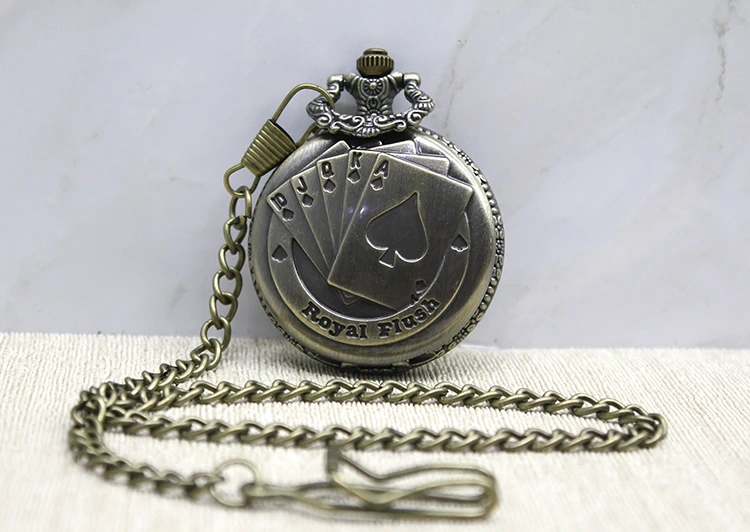 OYUN KARTI TASARIMLI KÖSTEKLİ SAATÜrün ÖzellikleriOyun kartı tasarımlı köstekli saat, iskambil kağıdı kabartmalı özel tasarımıyla dikkat çeker. Bronz kaplamalı metal gövdesi nostaljik bir görünüm sunarken, sağlam yapısı uzun ömürlü kullanım sağlar. Açılır kapak mekanizması sayesinde kolayca saat göstergesine ulaşabilirsiniz. Zinciri ile birlikte taşınabilir ve koleksiyon severler için harika bir tercihtir. Kumarhane, iskambil oyunları ve poker tutkunları için şık ve tematik bir aksesuardır.Paket İçeriği1 Adet Oyun Kartı Tasarımlı Köstekli Saat