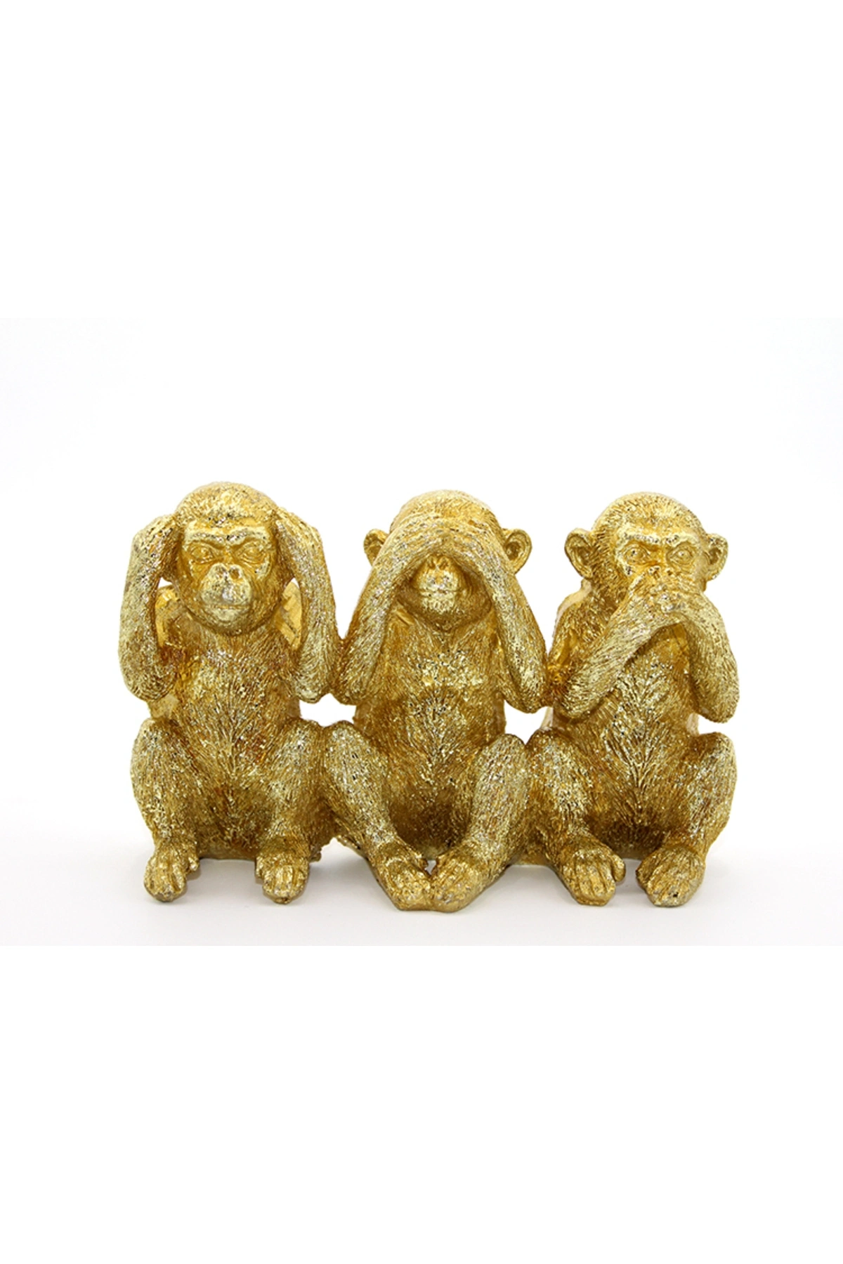 POLYESTER 3 MAYMUN - GÖRMEDİM DUYMADIM BİLMİYORUM Ürün Özellikleri Polyester 3 Maymun figürü, "Görmedim, Duymadım, Bilmiyorum" temalı altın renkli dekoratif bir obje olarak tasarlanmıştır.; 16x10 cm boyutundaki bu şık figür, anlamlı bir mesaj taşıyan, evde veya ofiste dekoratif amaçla kullanılabilecek zarif bir parçadır.; Altın rengi detayları ve polyester malzemesiyle uzun ömürlüdür.; Hem koleksiyonluk hem de anlamlı bir hediye olarak ideal bir seçenektir.; Paket İçeriği 1 Adet Polyester 3 Maymun - Görmedim Duymadım Bilmiyorum