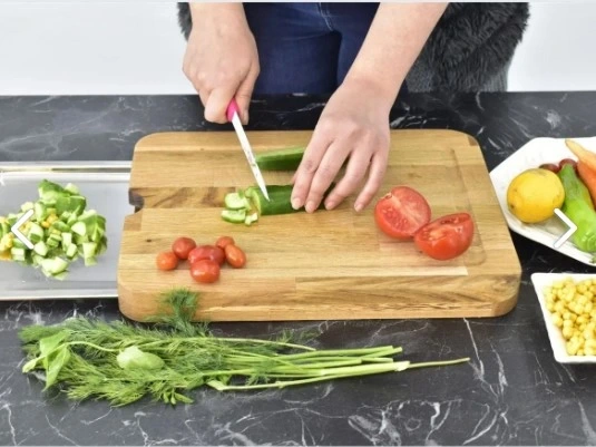 Ürün Açıklaması:Mutfaktaki en büyük yardımcınız olacak bu pratik ahşap kesme tahtası, gıda hazırlığını kolaylaştıran tasarımıyla dikkat çeker. Yanda yer alan metal tepsisi sayesinde doğradığınız malzemeleri hızlıca bir araya getirebilir, tezgahınızı temiz tutabilirsiniz. Sağlam ve hijyenik ahşap malzemesi, yiyeceklerle güvenle temas ederken uzun ömürlü kullanım sağlar.Kaliteli Malzeme: Doğal ahşaptan üretilmiştir, dayanıklıdır ve uzun süreli kullanım sağlar.Pratik Tepsi: Yan tarafında yer alan paslanmaz çelik tepsi, doğradığınız malzemeleri kolayca ayırmanıza yardımcı olur.Geniş Yüzey: Büyük boyutlu yüzeyi ile geniş bir çalışma alanı sunar.Kolay Temizlenir: Ahşap yüzeyi temizlenmesi kolaydır ve hijyeniktir.