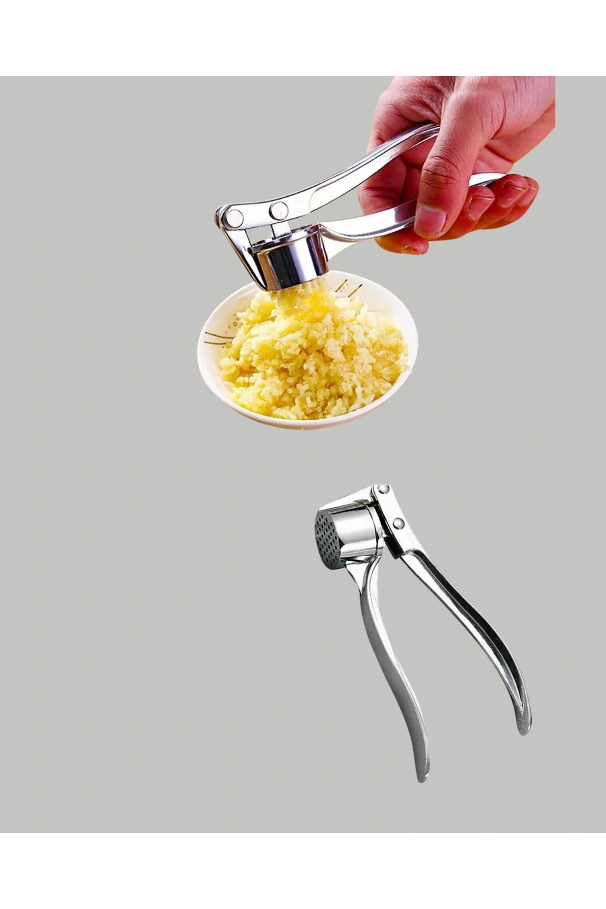 Metal Sarımsak Ezici, pratik kullanım sunan sağlam bir mutfak gerecidir.; Sarımsağı elinizle doğramadan, bıçak kullanmadan hızlıca ezebilir ve doğrudan yemeğe ekleyebilirsiniz.; Bu hem zamandan tasarruf sağlar hem de mutfakta hijyeni artırır.; Eliniz sarımsak kokmaz, kesilme veya kayma riski ortadan kalkar.; Güçlü baskı mekanizması sayesinde sarımsaklar tamamen ezilir ve ince kıvamlı bir püre hâline gelir.; Böylece tariflerde daha yoğun aroma elde edilir.; Ayrıca hem çiğ hem de pişmiş sarımsakta aynı performansı sunar.; Paslanmaz metal gövdesi uzun süreli kullanım için uygundur.; Ergonomik tutma kolları elinizde kaymaz ve sağlam kavrama sunar.; Bu özellik, özellikle küçük el yapısına sahip kullanıcılar için bile kolay kullanım sağlar.; Temizlik konusunda da oldukça kullanıcı dostudur.; İç kısmı geniş olduğu için yiyecek artıkları kolayca temizlenir.; Su altında yıkadıktan sonra kurutmanız yeterlidir.; Günlük yemeklerde, özel tariflerde ve yoğun mutfak hazırlıklarında büyük kolaylık sağlayan bu sarımsak ezici, pratikliğiyle mutfakların vazgeçilmez araçlarından biri olur.