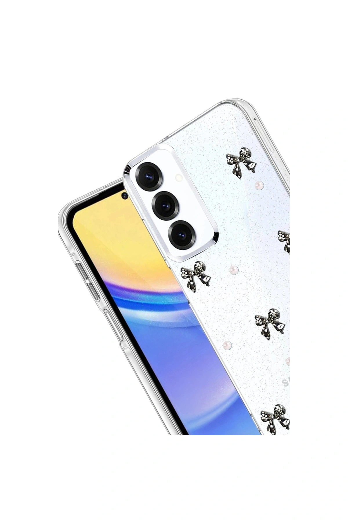 Fiyonk Desenli Kapak ✅ Zarafet ve Koruma Bir AradaFiyonk, yıldız, kelebek, lale, çiçek, kalp ve gül gibi zarif detaylarla süslenmiş bu kapak simli, şeffaf tasarımıyla estetik ve korumayı bir araya getiriyor.; Telefonunuzu yalnızca dış etkenlerden korumakla kalmaz, aynı zamanda ona göz alıcı bir stil kazandırır.; Günlük kullanımda dikkat çeken tasarımı sayesinde cihazınızın şıklığı öne çıkar.; ✅ Üstün Darbe KorumasıEsnek kenar yapısı ve dayanıklı malzemesiyle telefonunuzu darbelerden ve düşmelerden etkili bir şekilde korur.; Simli şeffaf yüzey, hem sağlamlık hem de görselliği bir arada sunarak cihazınızın görünümünü sergilemeye devam eder.; ✅ Konforlu ve Pratik Kullanımİnce ve hafif tasarımıyla telefonunuzu kalınlaştırmadan yüksek koruma sağlar.; Tüm tuşlar, bağlantı noktaları ve kamera çıkıntılarıyla tam uyumludur.; Kaymaz yüzeyi sayesinde elde daha güvenli bir tutuş sunar böylece günlük kullanımda rahatlık ve konfor sağlar.