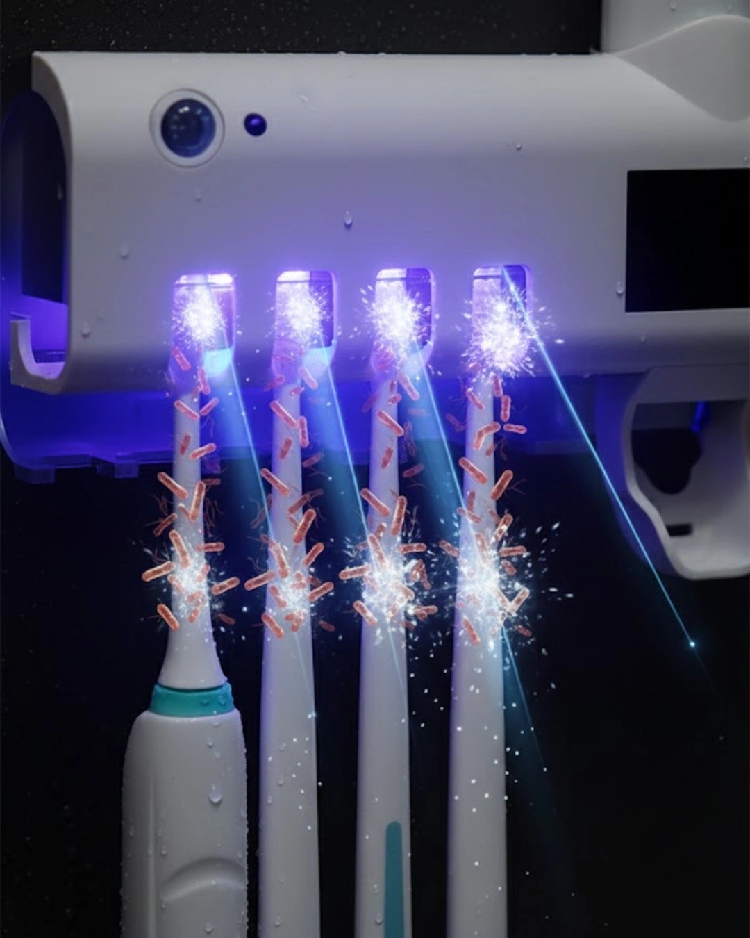 Bu çok fonksiyonlu diş fırçası tutucu, UV sterilizasyon, otomatik diş macunu sıkma ve düzenleyici tasarımı tek üründe birleştirir. Manyetik diş fırçası fincan sistemi sayesinde fırçalar ters şekilde asılarak hızlı kuruma sağlar. Su geçirmez plastik malzemeden üretilmiş gövdesi, banyo ortamına uzun süre dayanıklıdır. Otomatik diş macunu dağıtıcısı, her kullanımda ideal miktarda macun almanızı sağlar ve israfı önler. Alan tasarrufu sağlayan yapısıyla küçük banyolar için mükemmel bir çözümdür.