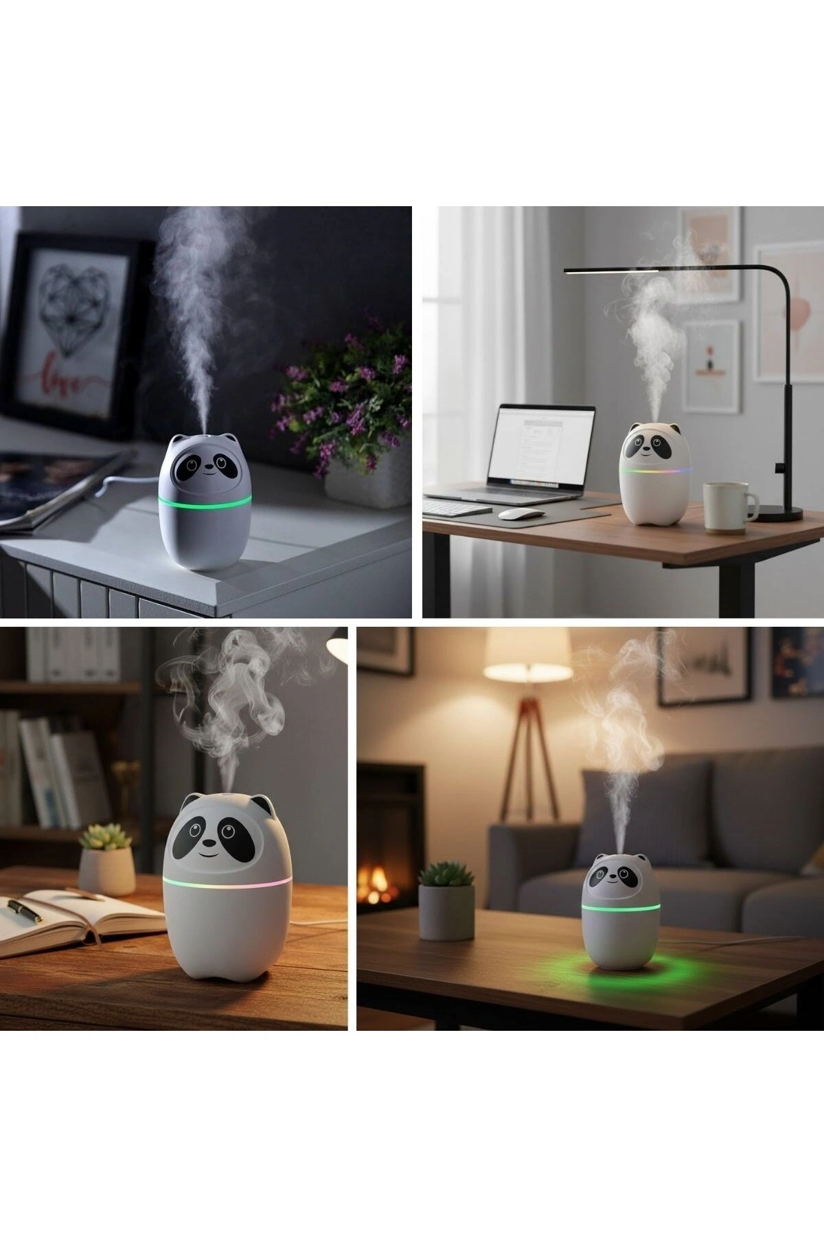 Sevimli Panda Figürlü Hava Nemlendirici – Ultrasonik Soğuk Buhar Makinesi, LED Işıklı Masaüstü Oda Nemlendirici Sevimli Panda Figürlü Hava Nemlendirici, eğlenceli panda tasarımı ve ultrasonik soğuk buhar teknolojisi ile yaşam alanlarınıza hem nem dengesi hem de dekoratif bir dokunuş kazandırır.; Kuru havanın neden olduğu boğaz kuruluğu, cilt kuruluğu ve rahatsız edici ortam havasını azaltmaya yardımcı olur.; Ultrasonik çalışma sistemi sayesinde suyu mikro parçacıklara ayırarak sessiz ve verimli bir şekilde soğuk buhar yayar.; LED ışıklı tasarımı, özellikle akşam ve gece saatlerinde ortama yumuşak bir ambiyans katar.; Masaüstü, komodin, ofis masası ve çocuk odalarında rahatlıkla kullanılabilir.; Kompakt ve hafif yapısı sayesinde yer kaplamaz, taşınması kolaydır.; USB bağlantısı ile pratik kullanım sunar.; Sevimli panda figürü sayesinde özellikle çocuk odaları için hem işlevsel hem de keyifli bir hava nemlendirici alternatifi oluşturur.; Öne Çıkan Özellikler ???? Sevimli panda figürlü dekoratif tasarım ???? Ultrasonik soğuk buhar teknolojisi ???? Sessiz çalışma ???? LED ortam ışığı ???? USB bağlantı ile pratik kullanım ???? Masaüstü, ofis ve çocuk odasına uygun Kullanım Alanları Ev ve ofis ortamları Çocuk & bebek odaları Çalışma masası & komodin Kuru hava koşullarında ortam nemlendirme