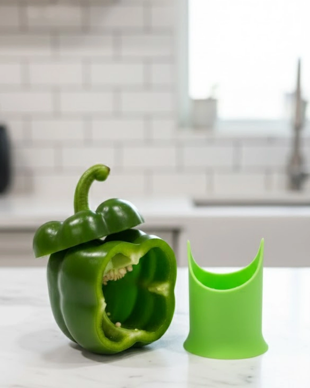 Silikon biber çekirdeği çıkarıcı aparat, hem biber hem de kabak içini temizlemek için kullanılabilen çok amaçlı bir mutfak ürünüdür. Sebzenin iç kısmındaki çekirdek ve lifleri tek parça halinde alır, böylece dolma veya yemek hazırlığı için pürüzsüz bir iç yüzey oluşturur. El ile temizlemeye kıyasla çok daha hijyenik ve pratiktir. Kaygan olmayan yapısı kontrolü artırır ve kullanım sırasında rahatlık sağlar. Küçük boyutu sayesinde çekmecede az yer kaplar ve her mutfakta kolayca saklanır.