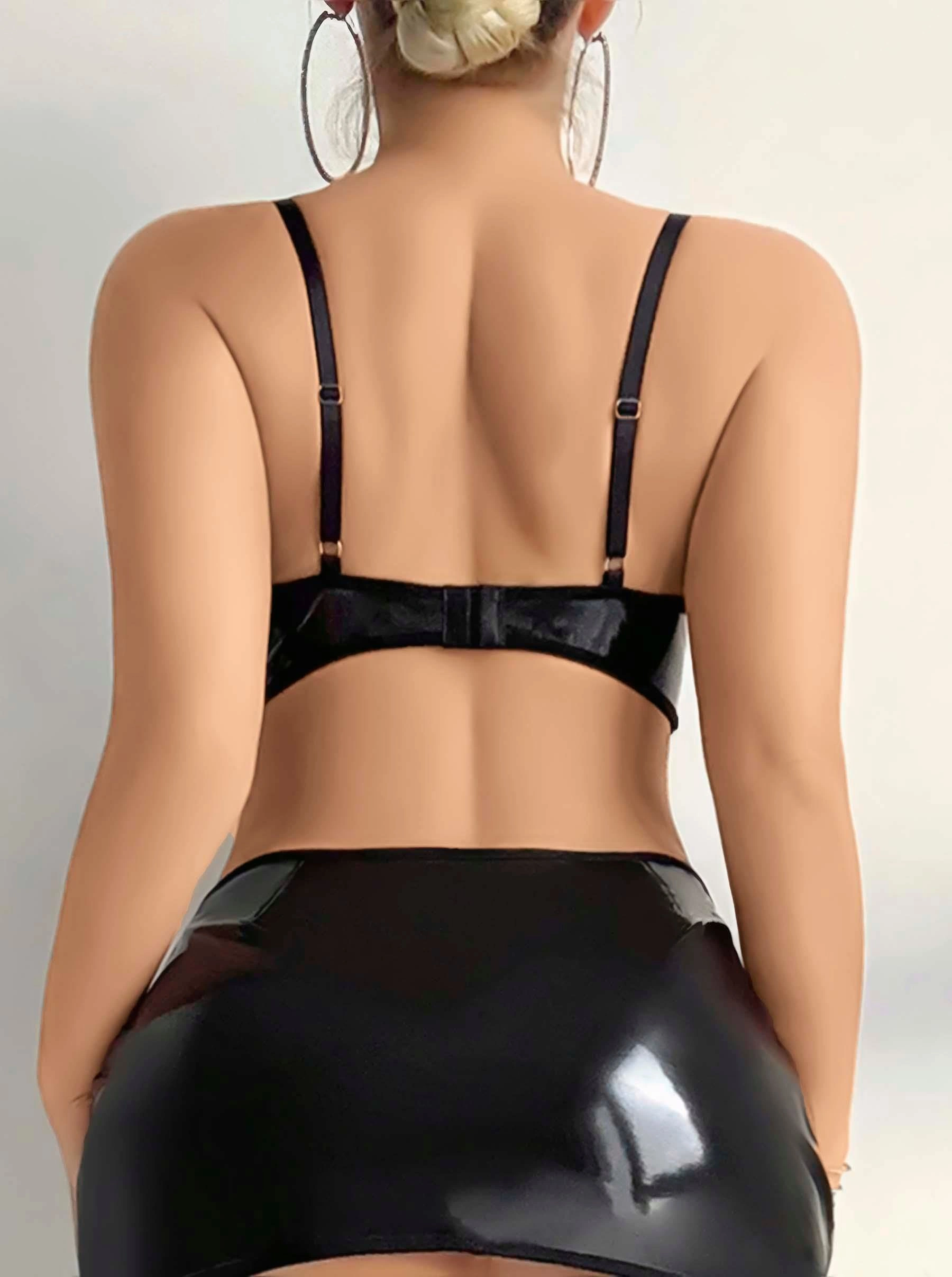 Siyah İp Dekolteli Mini Etekli Fantezi Parlak Deri Kostüm