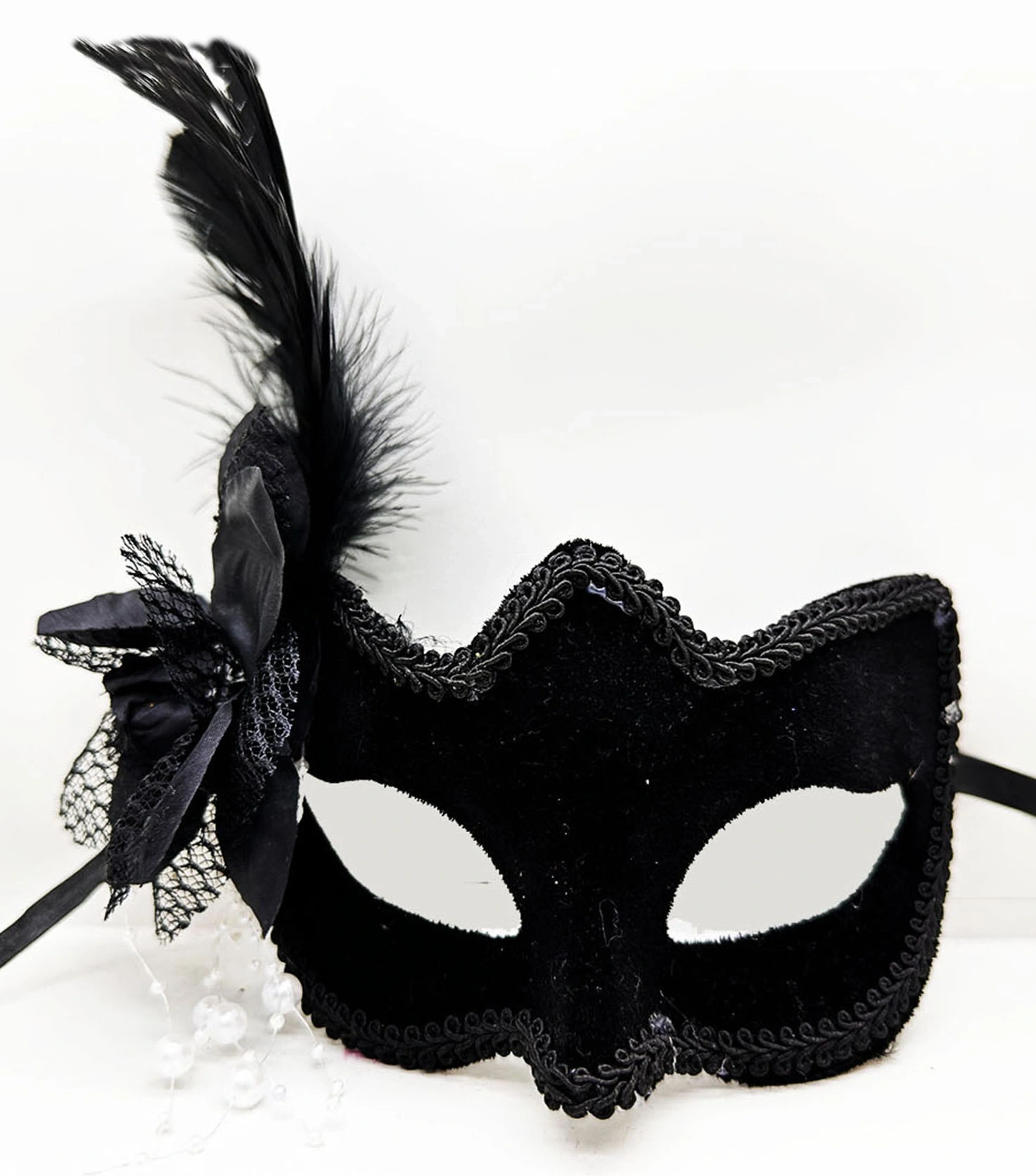 Siyah Süet Yandan Tüylü İncili Parti Maskesi