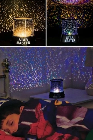 Ürün Özellikleri : Star master projeksiyon led lamba renklerin yavaş yavaş dönmesi ile odada ışık şöleni oluşturur. Üst kısımda bulunan kapağı açarak dilediğiniz duvara ya da tavana tutarak ışık renklendirmesi yapabilirsiniz. SM Işıltılı renklerle odanıza mükemmel bir hava katar. Rengârenk ışıkları seyretmek uykudan önce tüm yorgunluğunuzu alacaktır. Gece saatinde odanızın tamamını parlayan ışıklarla süsleyin ve romantik bir ortam oluşturun. Projeksiyon Gece Lambası SM'a çocuklarınız da hayran kalacak Çocuğunuzun odasını renklendirin, daha keyifli bir uyku uyumalarını sağlayın. Led ışık ve yansıtıcı iç yüzey ile renk cümbüşü yaşayın. Led seçeneğinde renkler yavaş bir şekilde otomatik değişir. Üst kısımda bulunan kabini çevirerek ışık yoğunluğunu duvara yada tavana daha yoğun aktarabilirsiniz. 3 adet AAA pil ile çalışır.( Piller kutu içeriğine dahil değildir.)