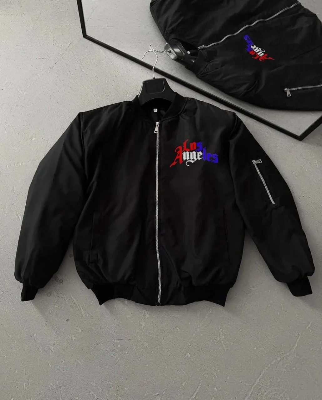 Tam Fermuarlı Uzun Kol Baskılı Bomber Ceket - Siyah