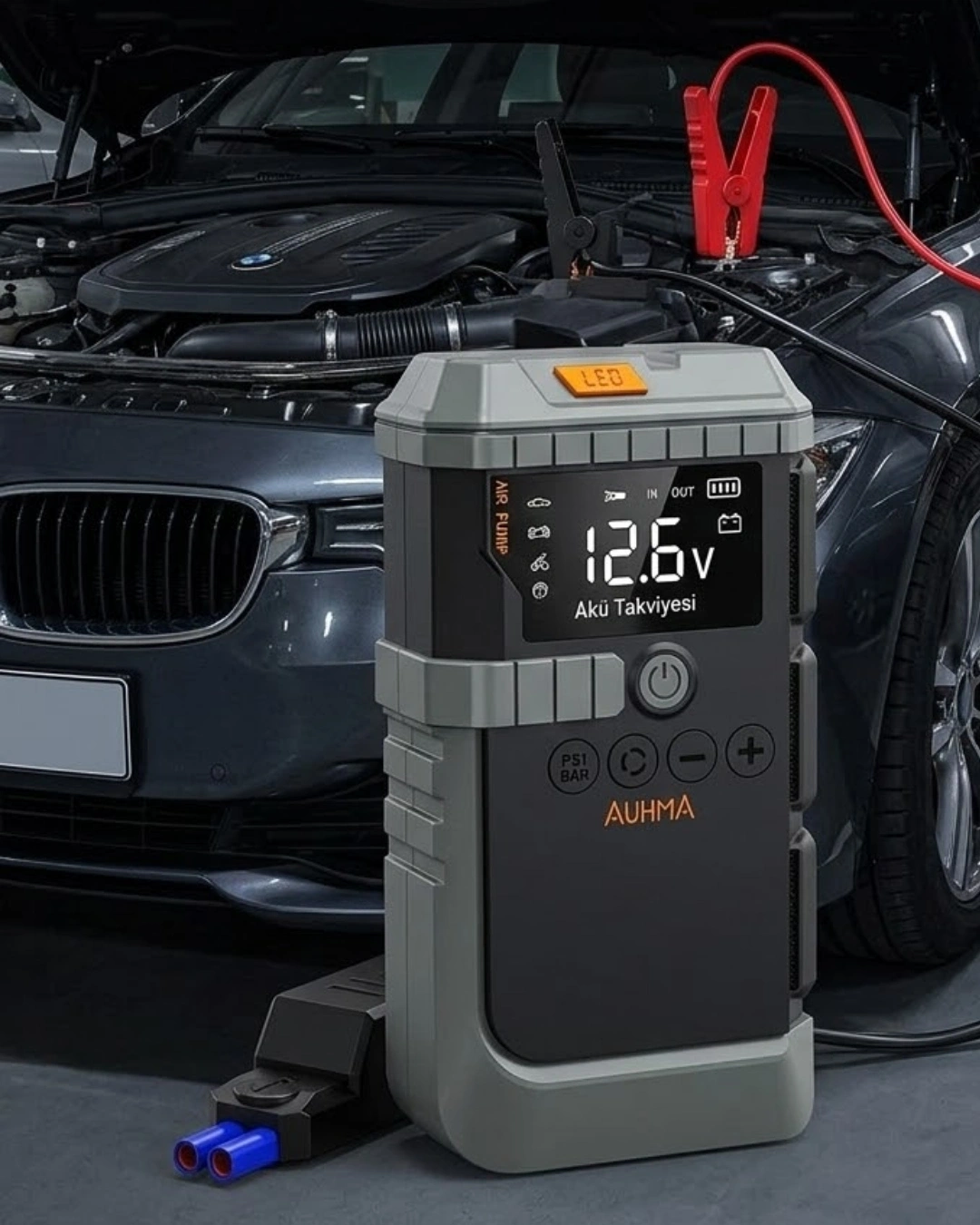 Bu taşınabilir çok fonksiyonlu araç cihazı, sürücülere hem güvenlik hem de pratik kullanım avantajı sunar. Araç akü takviyesi, hava kompresörü, powerbank ve LED aydınlatma özelliklerini bir araya getiren bu cihaz, yolculuk sırasında ihtiyaç duyabileceğiniz birçok işlevi tek bir ürünle karşılar. Akü takviye özelliği sayesinde araç aküsü bittiğinde aracınızı hızlı bir şekilde çalıştırabilirsiniz. Güçlü başlangıç akımı sayesinde benzinli motorlar için etkili bir destek sağlar. Akıllı koruma sistemi ters bağlantı ve aşırı akım gibi risklere karşı güvenli kullanım sunar. Cihazın entegre hava pompası, araç lastiklerinin doğru basınçta olmasını sağlar. Dijital basınç göstergesi sayesinde lastik basıncı net şekilde görüntülenebilir ve kolayca ayarlanabilir. Bu özellik hem sürüş güvenliğini artırır hem de lastik ömrünü uzatır. Farklı şişirme başlıkları sayesinde cihaz yalnızca araç lastikleri için değil, aynı zamanda bisiklet lastikleri, motosiklet lastikleri ve spor topları için de kullanılabilir. Bu sayede evde, garajda veya seyahat sırasında çok amaçlı kullanım sunar. USB çıkışları sayesinde cihaz aynı zamanda bir güç bankası görevi görür. Elektronik cihazlarınızı şarj ederek enerji ihtiyacınızı karşılar. Bu özellik özellikle uzun yolculuklarda ve kamp aktivitelerinde oldukça faydalıdır. LED ışık sistemi karanlık ortamlarda güvenli kullanım sağlar. Gece araç kontrolü, kamp ortamı veya acil durumlarda güçlü ışık ile çevreyi aydınlatabilir. SOS ışık modu ise dikkat çekmek için kullanılabilir. Taşınabilir ve dayanıklı yapısı ile bu çok fonksiyonlu araç cihazı, sürücüler için pratik bir yol yardım çözümü sunar. Araç bagajında bulundurulabilecek en kullanışlı ekipmanlardan biri olarak öne çıkar.
