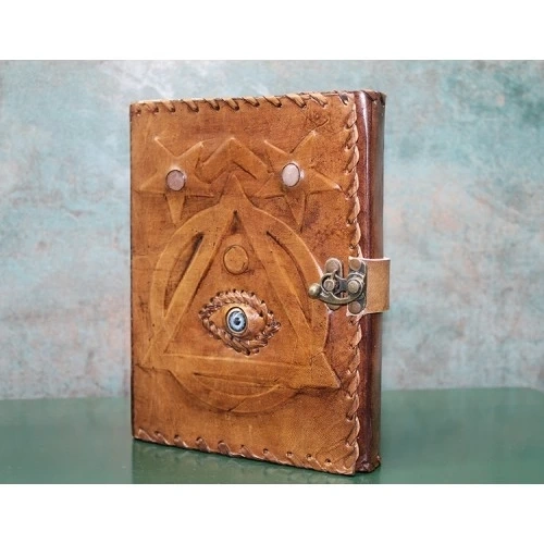 TAŞLI DERİ DEFTER MODEL 4Ürün ÖzellikleriTaşlı Deri Defter Model 4, mistik tasarım ve göz ile üçgen figürleri içeren etkileyici bir defterdir. Deri kapak üzerine yapılan mistik işleme ve taş süslemeleri, bu deftere büyüleyici bir hava katmaktadır. 18x13 cm ölçülerindeki bu defter, kişisel kullanım veya hediye olarak ideal bir tercihtir. Şık ve dayanıklı yapısı, uzun ömürlü kullanım sunar ve içindeki taşlarla zarif bir görünüm elde edilir. Not almak veya yazı yazmak için mükemmel bir araçtır.Paket İçeriği1 adet Taşlı Deri Defter Model 4.