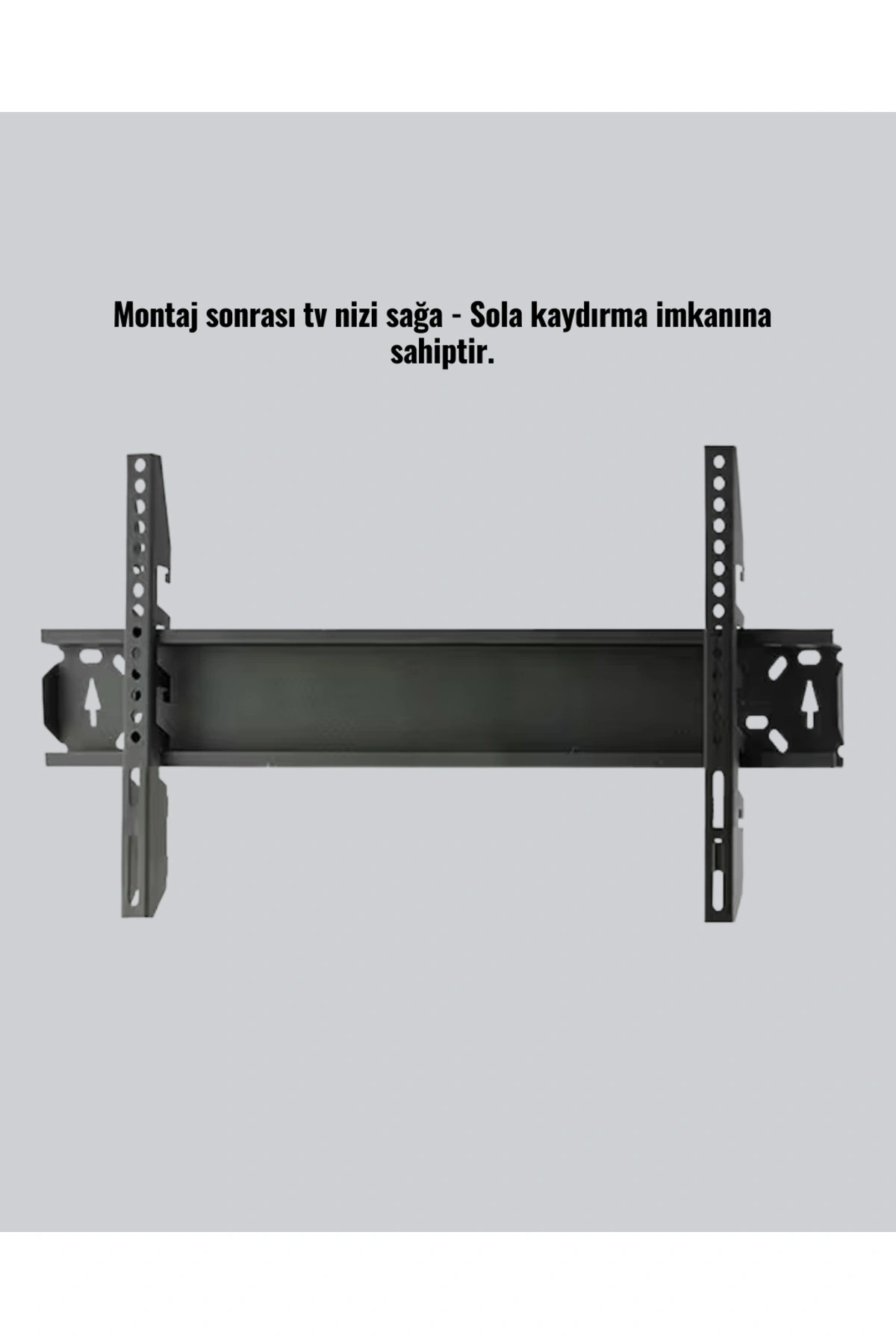 Bu TV askı aparatı, 32 ila 65 inç arasındaki televizyon modelleriyle uyumlu, sağlam ve çok yönlü bir montaj çözümüdür.; Özellikle büyük ekran televizyonlarda güvenli kullanım için tasarlanan ürün, 75 kg taşıma kapasitesi ile sektör standartlarının üzerinde bir güç sunar.; Gövdede kullanılan ekstra güçlendirilmiş çelik, televizyonun duvarda tam sabit şekilde durmasını sağlar.; Ağır ekranlarda bile esneme, eğilme veya titreşim oluşmaz.; Ürün materyallerinin tamamı Türkiye’de üretilmiş olup 1. sınıf kaliteye sahiptir.; Montaj sonrası ekranı sağa–sola kaydırma özelliği, duvar üzerinde hizalama imkânı sunar.; Ekranı tam merkeze oturtmak için tekrar söküp takmaya gerek yoktur.; Ayrıca 3 kademe yükseklik ayarı, ekranı kullanıcıya göre ideal pozisyona getirme imkânı sağlar.; Anti-statik toz boya kaplaması, ürünün yüzeyini çizilme, paslanma ve dış etkenlere karşı dayanıklı hale getirir.; Bu özellik uzun süreli kullanım için önemli bir avantajdır.; Kurulum sürecinde kullanıcıları yönlendiren kurulum kılavuzu, montajı kolaylaştırır.; Vida ve dübel setinin kutuda bulunması, ekstra malzeme arayışını ortadan kaldırır.; Bu askı aparatı; ev, ofis, mağaza, restoran, otel ve eğitim alanlarında kullanılabilecek profesyonel bir montaj ürünüdür.; Hem sağlamlık hem modern görünüm sunması ile geniş ekran TV’ler için ideal bir tercihtir.