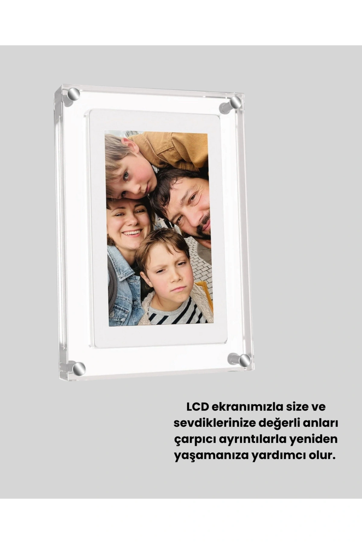 7 inç IPS ekranlı dijital fotoğraf çerçevesi, 1024x600 çözünürlük ve 450 nit parlaklık ile anılarınızı kristal netliğinde görüntüler.; IPS panel teknolojisi, fotoğrafları her açıdan canlı renklerle izleme imkânı tanır.; Dahili 4 GB hafıza, yüzlerce fotoğrafı ve videoyu kolayca saklarken, USB Type-C bağlantısı sayesinde hızlı şarj ve veri aktarımı sağlanır.; Üzerinde bulunan AÇ/KAPA, Oynat/Durdur ve Ses Kontrol düğmeleri ile kullanımı oldukça pratiktir.; Çift stereo hoparlörü, sadece görseller değil aynı zamanda müzik ve videolarda da etkileyici bir deneyim sunar.; Fotoğraflarınızı slayt gösterisi modunda oynatarak özel anlarınıza hareket katabilir, sevdiklerinizle geçirdiğiniz hatıraları canlı tutabilirsiniz.; Ev, ofis veya hediye amaçlı kullanım için ideal olan bu dijital çerçeve, modern tasarımıyla her ortamda şık bir dekoratif obje olarak öne çıkar.; Hafif yapısı sayesinde kolayca taşınabilir ve farklı alanlarda kullanılabilir.; Hem görüntü hem ses desteği ile çoklu medya keyfini tek cihazda yaşamak isteyenler için mükemmel bir çözümdür.