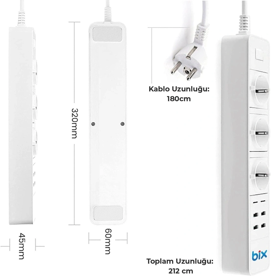 Akım Korumalı 2’li Ayrı Anahtarlı Priz, 2x Priz, 3x Usb, 1x Type-c, 2 Mt Kablo, Hızlı Şarj